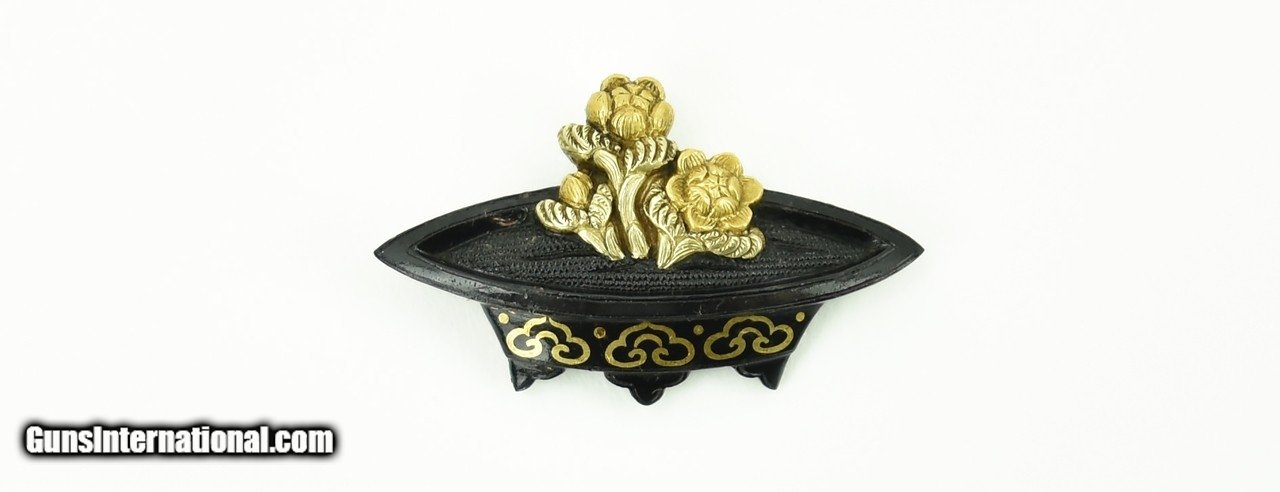 Description: "Kinko Menuki. Flowers on Jardinere. Shakudo and gold. Signed: Nakajima Haru Teru Yanagawa School. Mid-19th Century. Lived in Edo to the age of 76. SOLD |