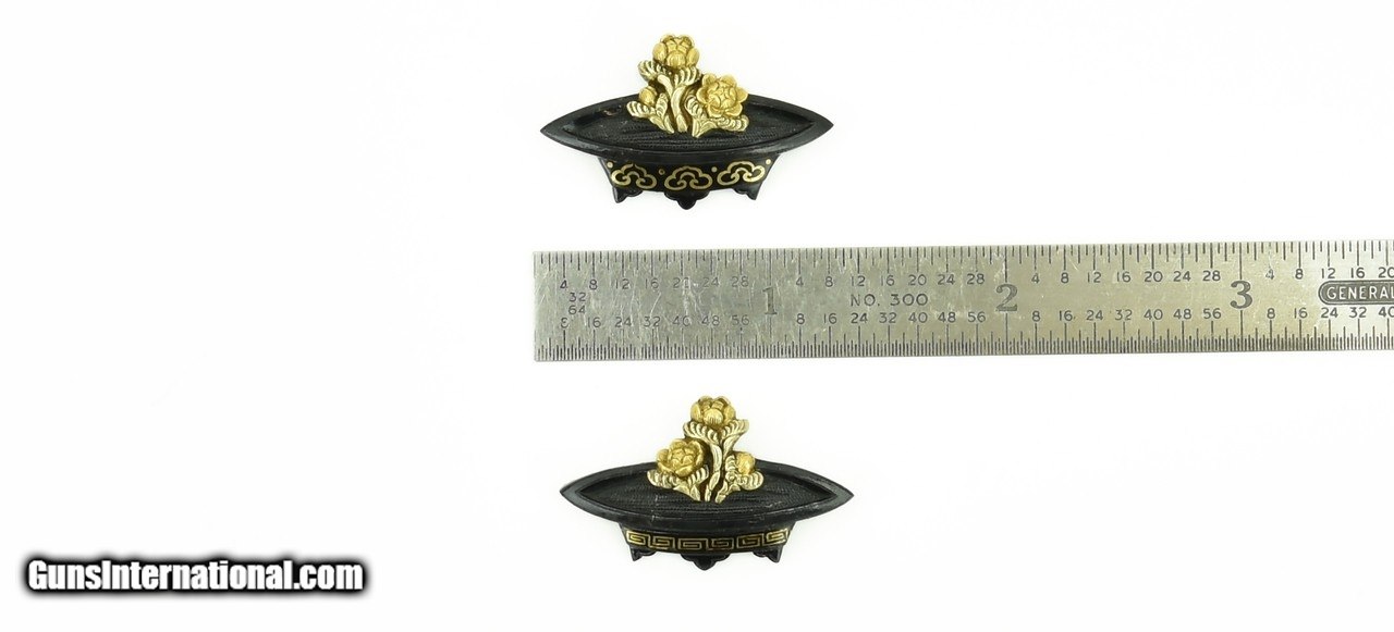 Description: "Kinko Menuki. Flowers on Jardinere. Shakudo and gold. Signed: Nakajima Haru Teru Yanagawa School. Mid-19th Century. Lived in Edo to the age of 76. SOLD |
