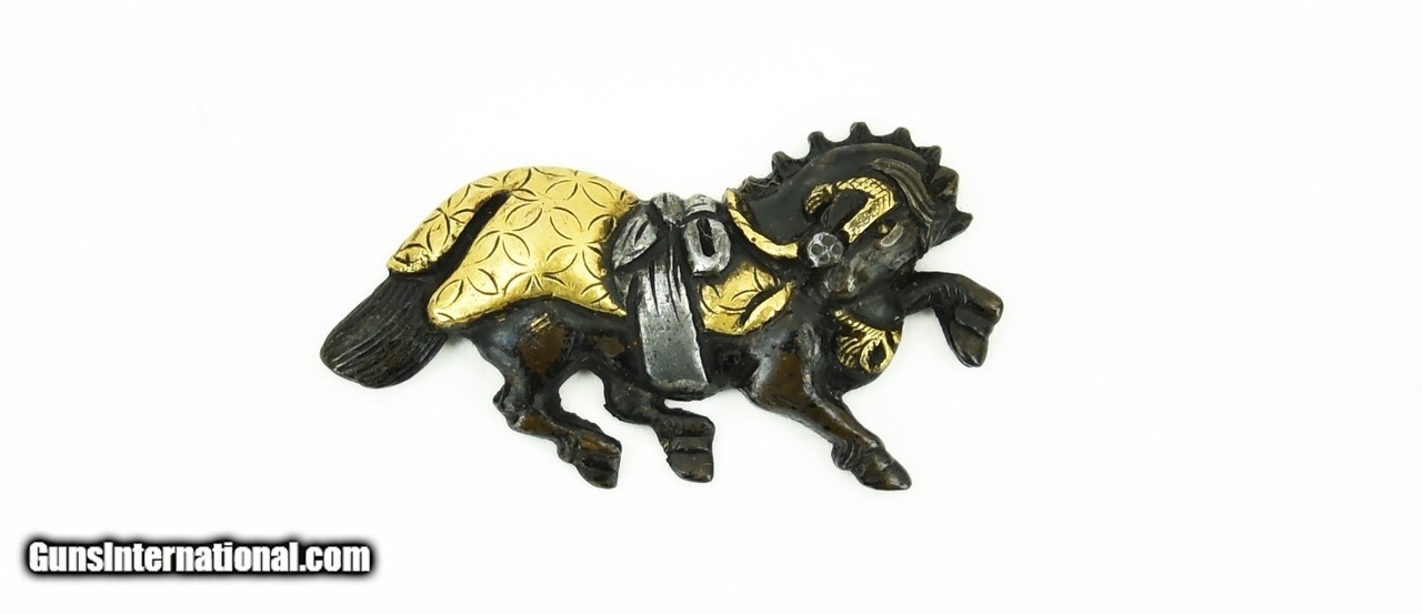 Description: "Kinko Menuki. Shakudo horses with shibuichi saddles. Horses reins and saddle blanket are gold. Unsigned. Fine workmanship. SOLD |