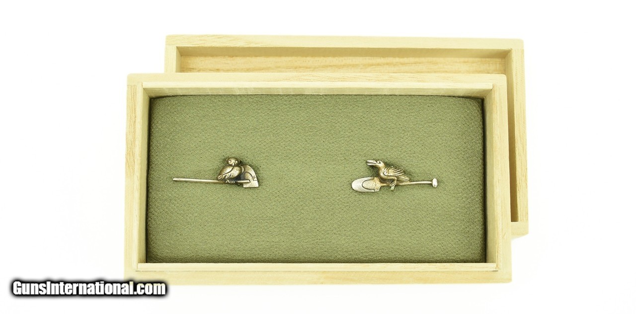 Description: "Kinko Menuki. Solid silver Wakazashi or Tanto size of birds. One bird sitting on spade, the other sitting on axe. Not signed. Very unusual subject manner. SOLD |