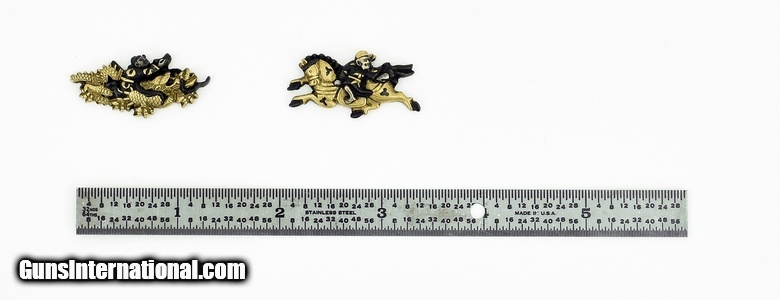Description: "Kinko Menuki. One figure riding a horse and other riding a dragon. Gold, silver and shakudo highlights. SOLD |