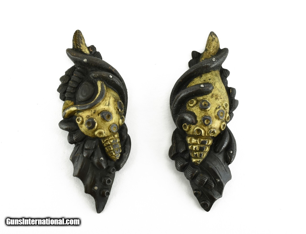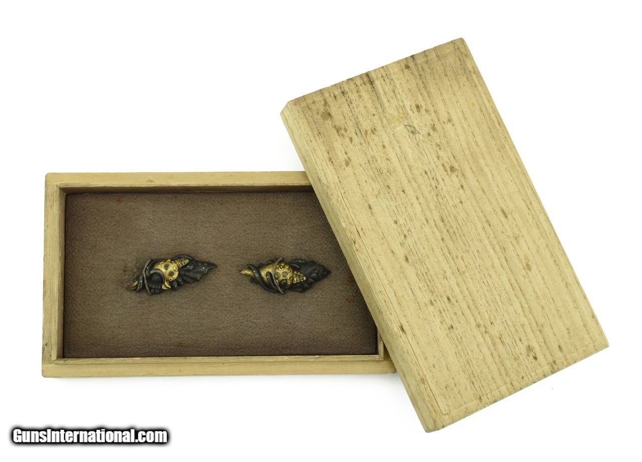 Description: "Kinko Menuki with Nautilus shells with shakudo sea cucumbers. Unsigned. Boxed. SOLD |