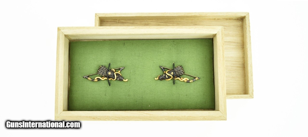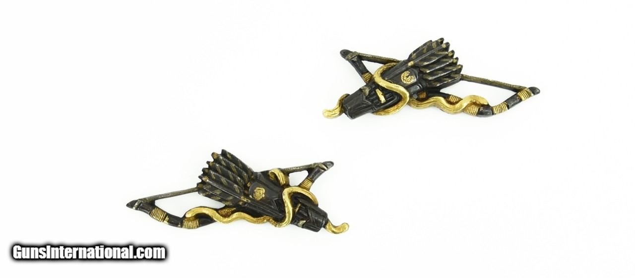 Description: "Kinko Menuki Shakudo. Bow and Arrow motif with gold highlights. Fine detail. Excellent condition. SOLD |