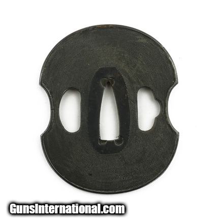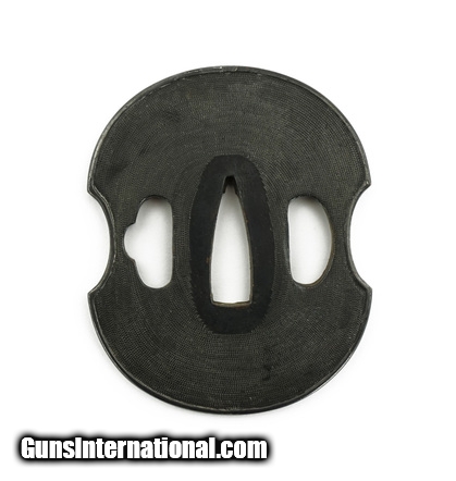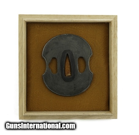 Description: "Kinko Tsuba. Shakudo with very fine nanako. Boxed. Unsigned. Vertical height is 2 7/8" (7.2 cm). Unusual form. SOLD |
