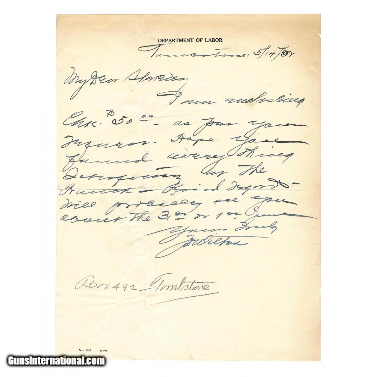 Description: " Letter with the Department of Labor letter head disclosing a check in the amount of $50.00 attributed to Box 492 Tombstone, AZ. This item came from John Flood who was Wyatt and Sadie Earp’s personal Secretary and closest confidant. Mr. Flood even wrote a biography on Wyatt Earp that was never published. He was given and inherited numerous items from the Earp’s. Mr. Flood in turn passed the Earp collection on to John Gilchriese. Mr. Gilchriese owned and operated The Wyatt Earp Museum in Tombstone, AZ, where all of these items were displayed. These items were sold directly by Mr. Gilchriese to David Roberts along with Mr. Gilchriese’s notes on each item. Each item comes with a certificate of authenticity from Collectors Firearms. SOLD |