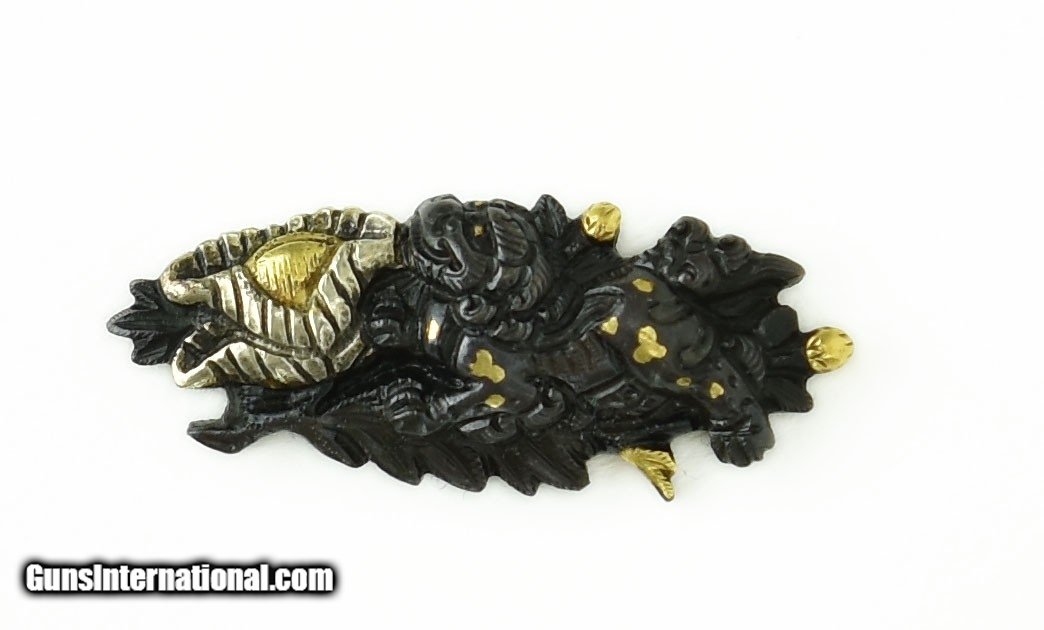 Description: "Menuki Shishi Amidst Flowers Shakudo with gold and silver highlights. Excellent condition. SOLD |
