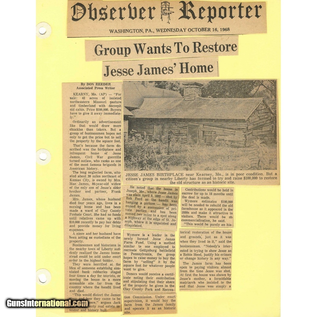 Newspaper clippings from the Observer Reporter Washington, PA dated October 16th 1968. The clippings are about restoring the Jesse James Home. This item / These items came from John Flood who was Wyatt and Sadie Earp’s personal Secretary and closest confidant. Mr. Flood even wrote a biography on Wyatt Earp that was never published. He was given and inherited numerous items from the Earp’s. Mr. Flood in turn passed the Earp collection on to John Gilchriese. Mr. Gilchriese owned and operated The Wyatt Earp Museum in Tombstone, AZ, where all of these items were displayed. These items were sold directly by Mr. Gilchriese to David Roberts along with Mr. Gilchriese’s notes on each item. Each item comes with a certificate of authenticity from Collectors Firearms.