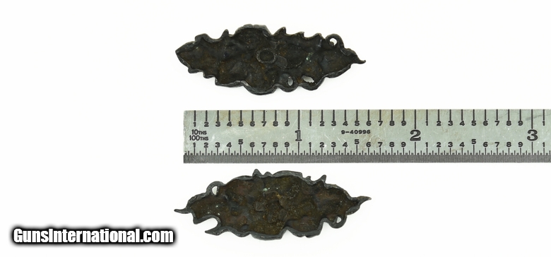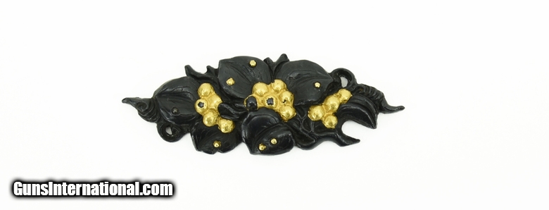 Description: " Pair of Menuki. Shakudo ground. Gold berries with tendrils. SOLD |