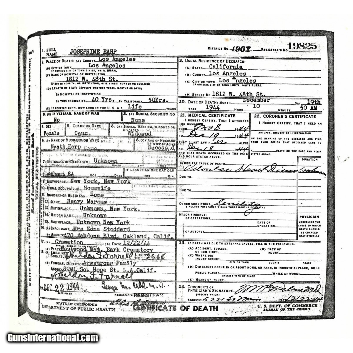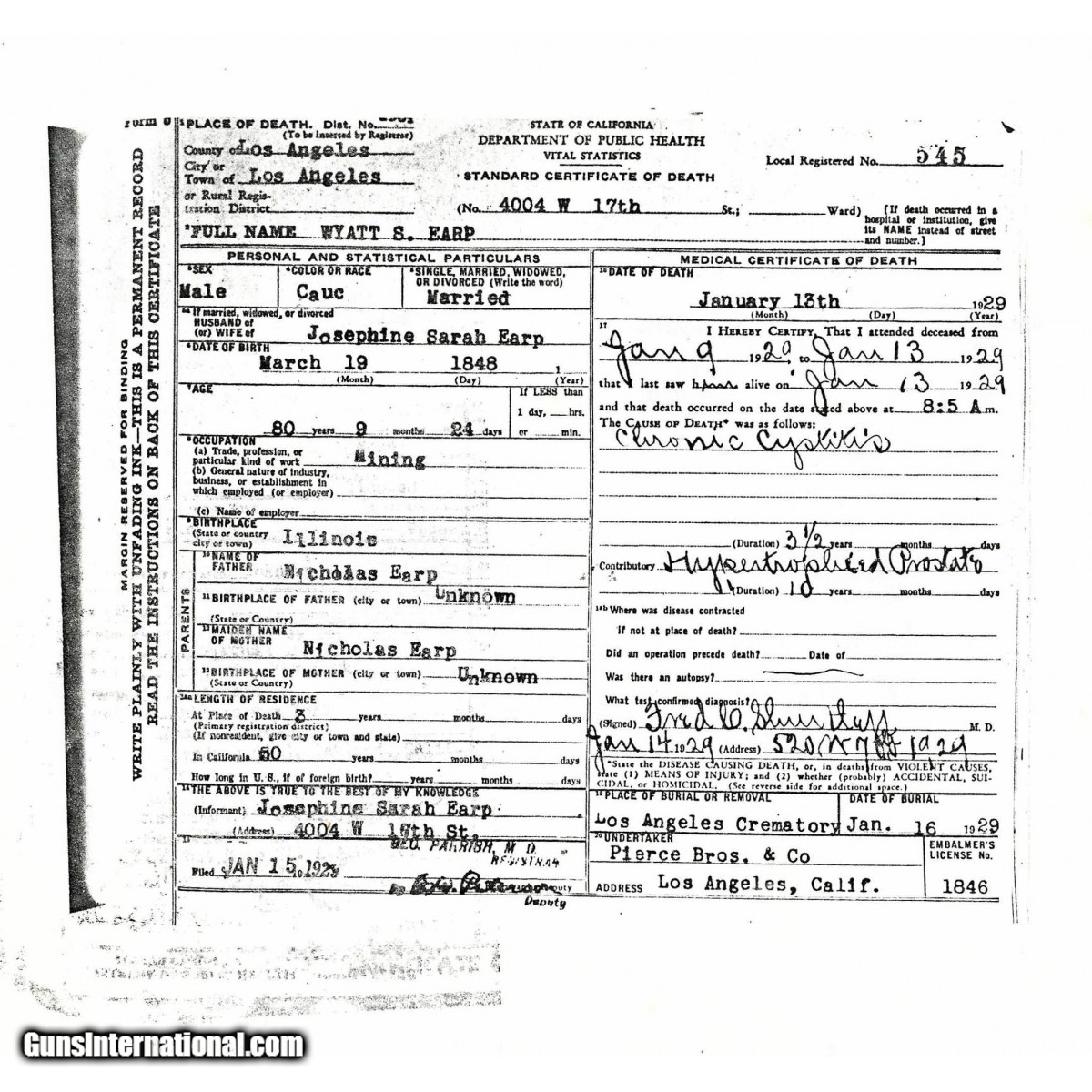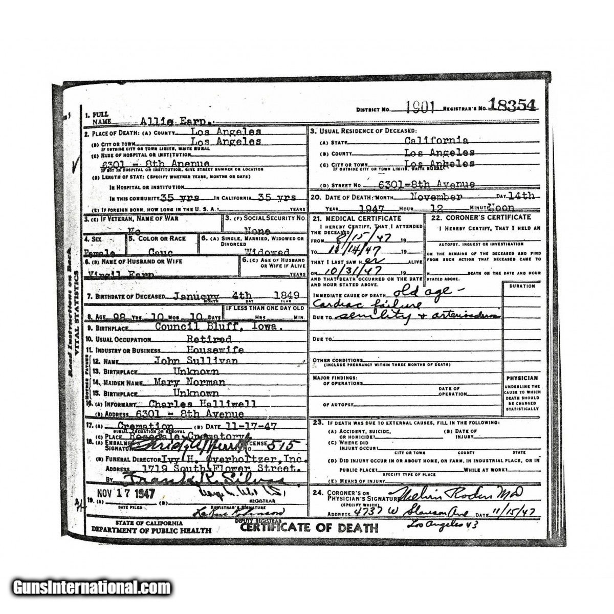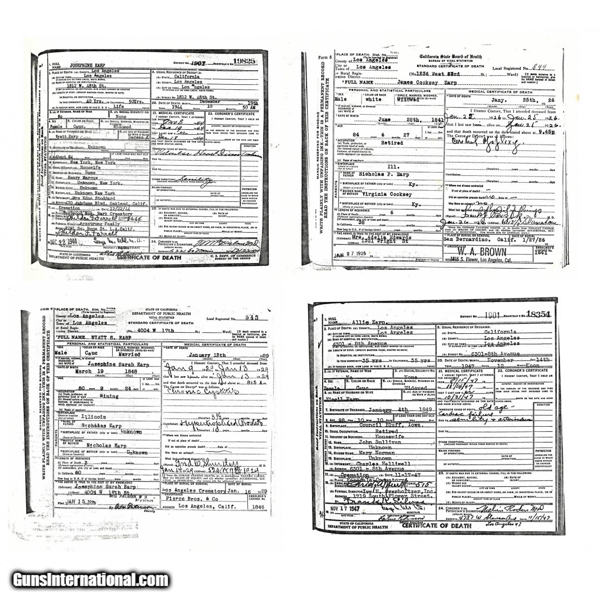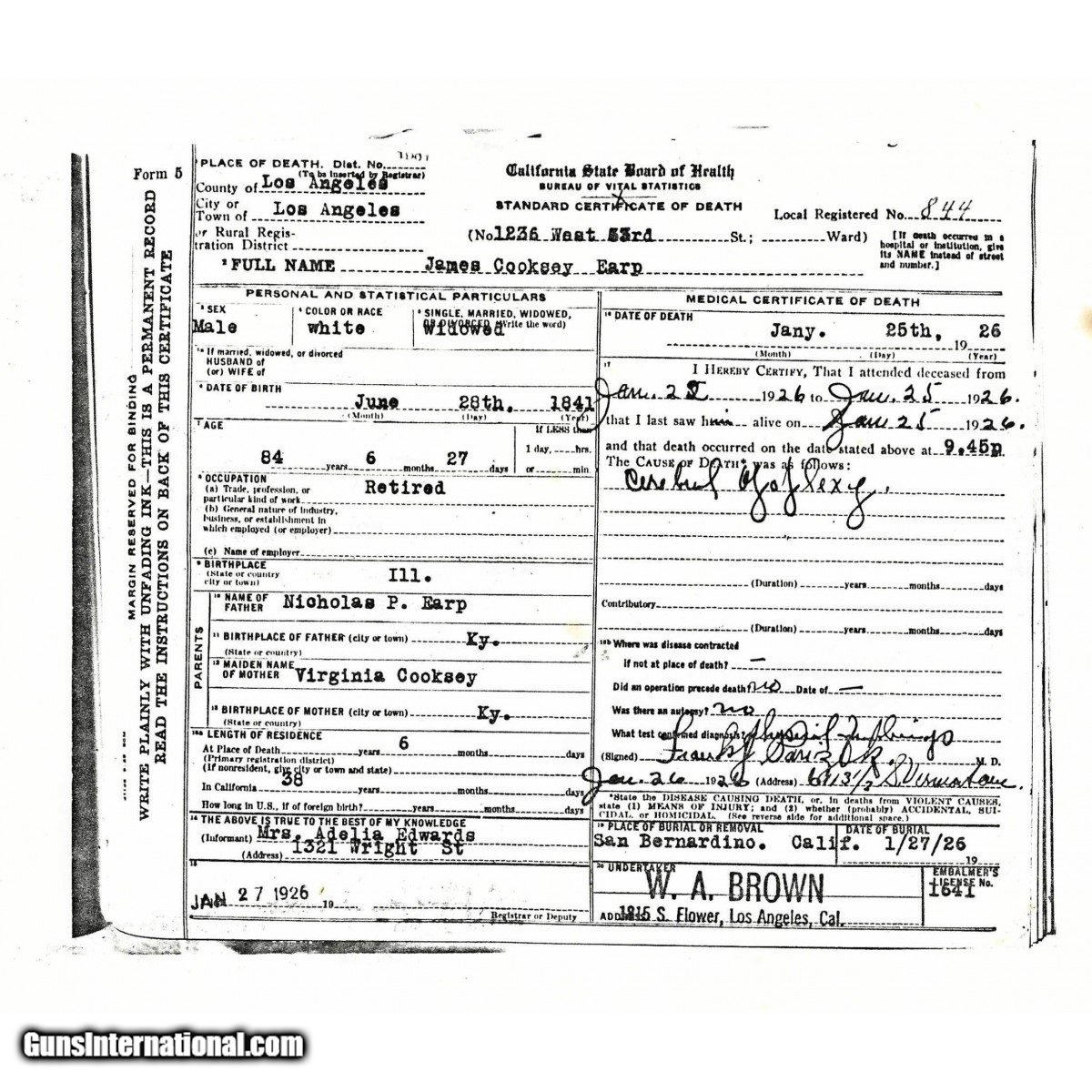 Photo copies of Wyatt Earp, James Cooksey Earp, Allie Earp and Josephine Earp Death certificates. This item / These items came from John Flood who was Wyatt and Sadie Earp’s personal Secretary and closest confidant. Mr. Flood even wrote a biography on Wyatt Earp that was never published. He was given and inherited numerous items from the Earp’s. Mr. Flood in turn passed the Earp collection on to John Gilchriese. Mr. Gilchriese owned and operated The Wyatt Earp Museum in Tombstone, AZ, where all of these items were displayed. These items were sold directly by Mr. Gilchriese to David Roberts along with Mr. Gilchriese’s notes on each item. Each item comes with a certificate of authenticity from Collectors Firearms.