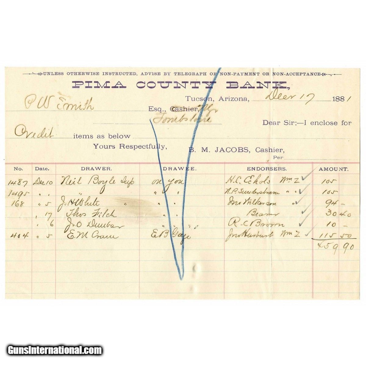 Pima County Bank Note written sometime in 1880s. Overall very condition with Tombstone history. This item came from John Flood who was Wyatt and Sadie Earp’s personal Secretary and closest confidant. Mr. Flood even wrote a biography on Wyatt Earp that was never published. He was given and inherited numerous items from the Earp’s. Mr. Flood in turn passed the Earp collection on to John Gilchriese. Mr. Gilchriese owned and operated The Wyatt Earp Museum in Tombstone, AZ, where all of these items were displayed. These items were sold directly by Mr. Gilchriese to David Roberts along with Mr. Gilchriese’s notes on each item. Each item comes with a certificate of authenticity from Collectors Firearms.