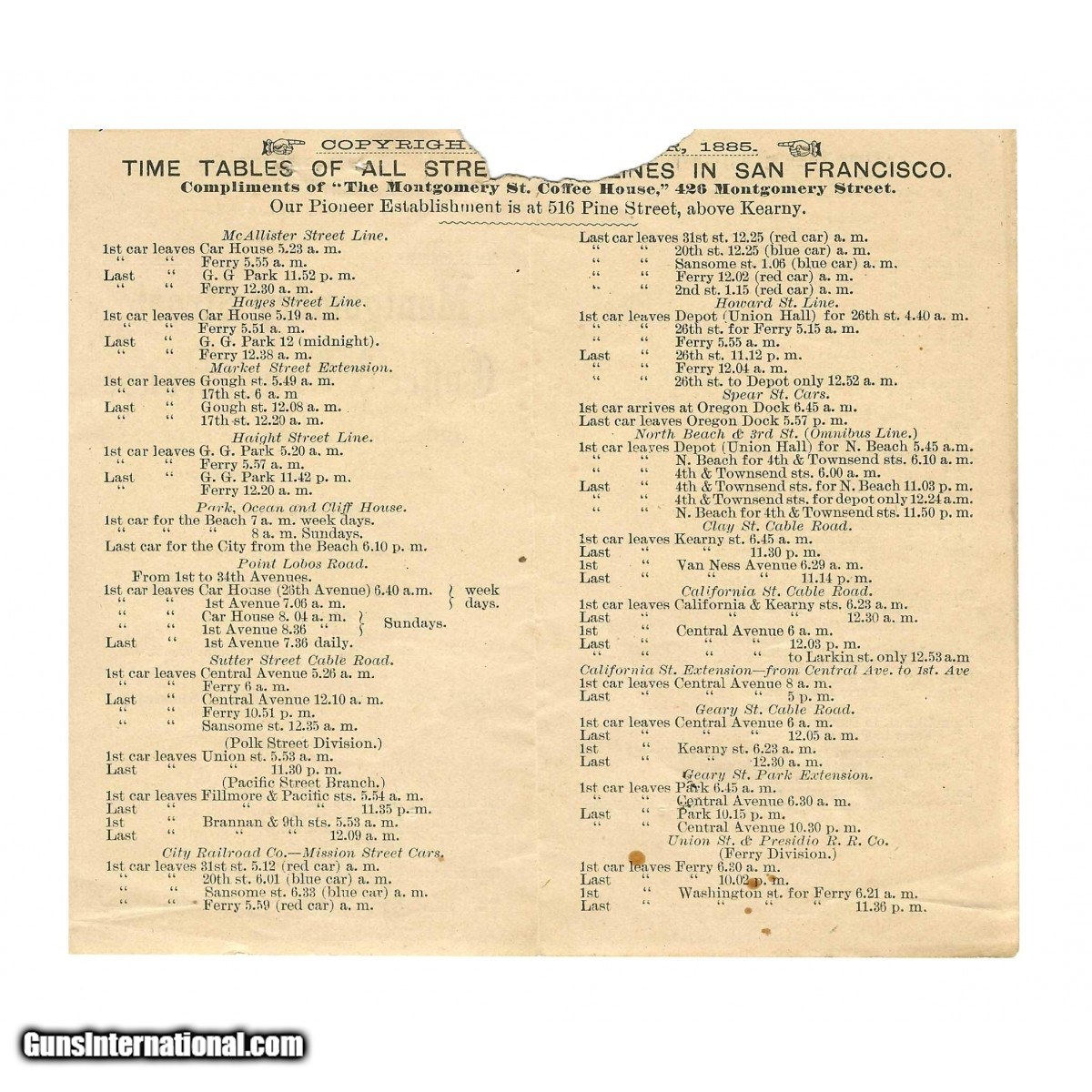 Description: " This is a San Francisco Cable Car Schedule owned by Sadie Earp. The front of the schedule has an ad for the Montgomery Street Coffee & Lunch House and it is dated 1885. This item came from John Flood who was Wyatt and Sadie Earp’s personal Secretary and closest confidant. Mr. Flood even wrote a biography on Wyatt Earp that was never published. He was given and inherited numerous items from the Earp’s. Mr. Flood in turn passed the Earp collection on to John Gilchriese. Mr. Gilchriese owned and operated The Wyatt Earp Museum in Tombstone, AZ, where all of these items were displayed. These items were sold directly by Mr. Gilchriese to David Roberts along with Mr. Gilchriese’s notes on each item. Each item comes with a certificate of authenticity from Collectors Firearms. SOLD |
