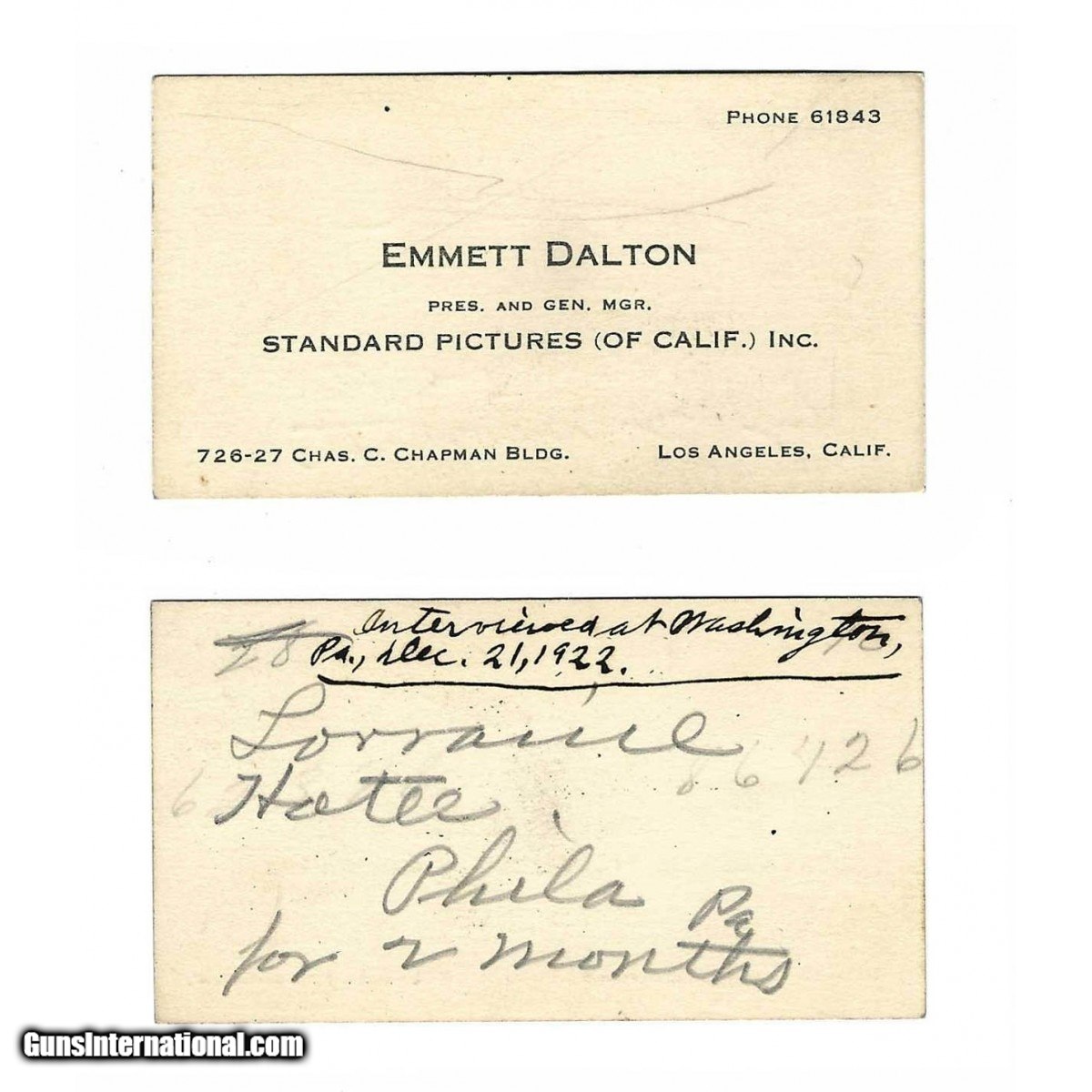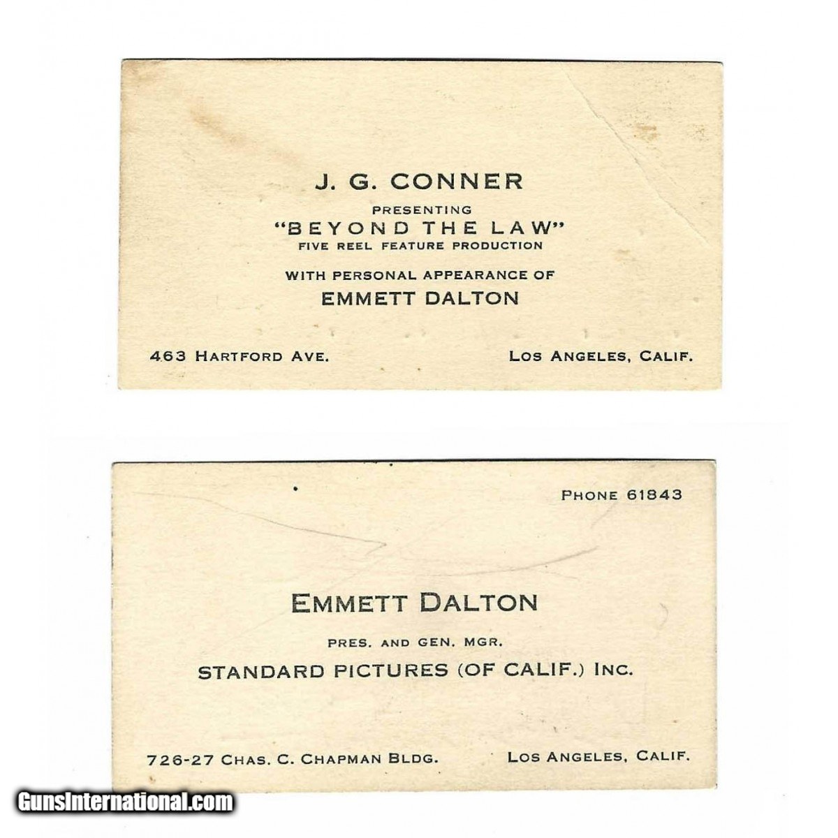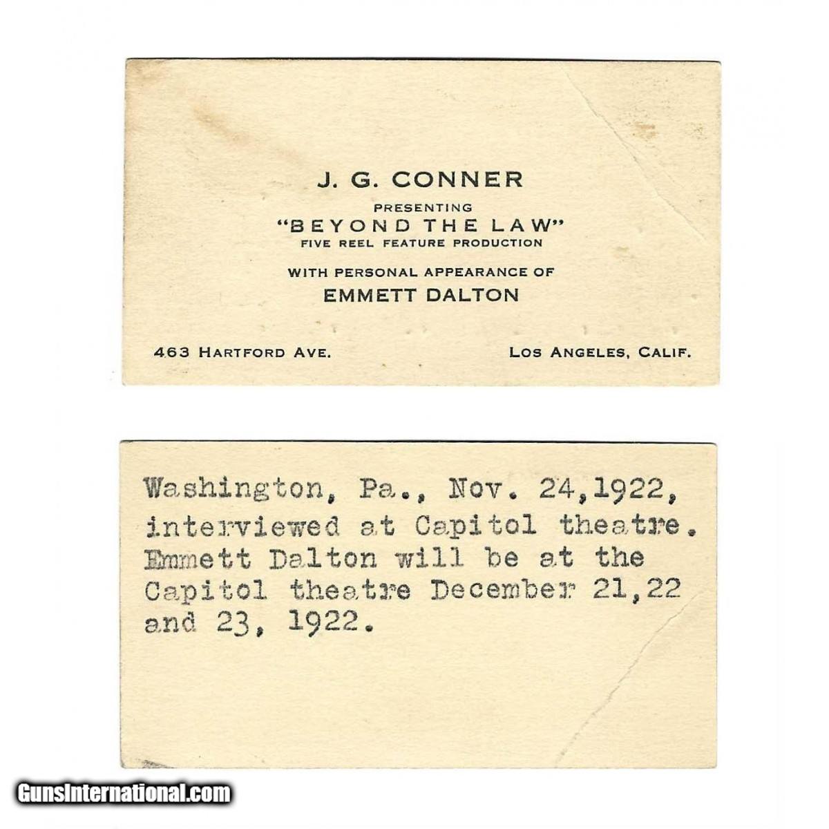 Two business cards for J.G. Conner and Emmett Dalton. Mr. Conner’s card states presenting “Beyond the law" five-reel feature production with personal appearance of Emmett Dalton. Emmett Dalton’s card states “Pres. And Gen. Mgr. Standard pictures (of Calif) INC. Both cards are in overall good condition with some age noted. Emmett Dalton is the only survivor from the Dalton Gang and was shot 27 times. This item / These items came from John Flood who was Wyatt and Sadie Earp’s personal Secretary and closest confidant. Mr. Flood even wrote a biography on Wyatt Earp that was never published. He was given and inherited numerous items from the Earp’s. Mr. Flood in turn passed the Earp collection on to John Gilchriese. Mr. Gilchriese owned and operated The Wyatt Earp Museum in Tombstone, AZ, where all of these items were displayed. These items were sold directly by Mr. Gilchriese to David Roberts along with Mr. Gilchriese’s notes on each item. Each item comes with a certificate of authenticity from Collectors Firearms.