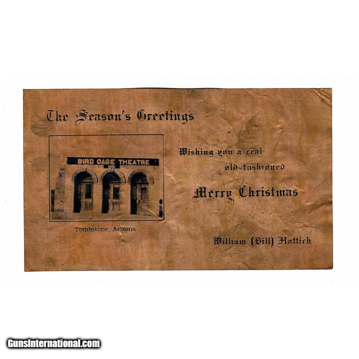 Description: " William Hattich Christmas card made of copper, Bird Cage Theatre Tombstone, Arizona. These items came from John Flood who was Wyatt and Sadie Earp’s personal Secretary and closest confidant. Mr. Flood even wrote a biography on Wyatt Earp that was never published. He was given and inherited numerous items from the Earp’s. Mr. Flood in turn passed the Earp collection on to John Gilchriese. Mr. Gilchriese owned and operated The Wyatt Earp Museum in Tombstone, AZ, where all of these items were displayed. These items were sold directly by Mr. Gilchriese to David Roberts along with Mr. Gilchriese’s notes on each item. Each item comes with a certificate of authenticity from Collectors Firearms. SOLD |