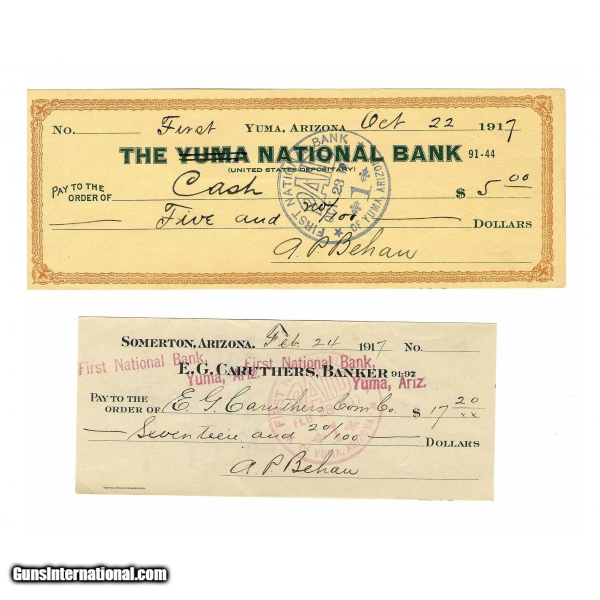 "Yuma & Caruthers Bank Checks dated 1917 to A.P. Behan (son to John Behan (WEC210)