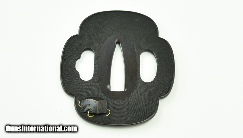 Description: Tsuba flute, bells, and musical instruments. Very fine Shakudo and extremely fine Nanako work. Wakizashi size. Gold and silver highlights. Very fine work. SOLD |