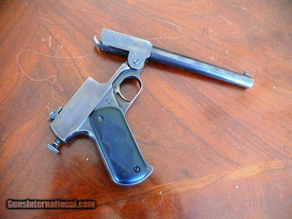 Description: Sale pending to KC...on the Sant Fe River // Stevens Single shot tip up pistol in 22lr Has an excellent bore. The original grips are free of any cracks or chips. Marked as having been Patented on April 27th , 1920. Has a nice smooth metal finish that has begun turning to a pantine. Must ship to an FFL; credit cards accepted but please add the 3% fee. You will pay the actual shipping to your FFL holder. If you have any questions, please let me know. Strength and Honor! SOLD |