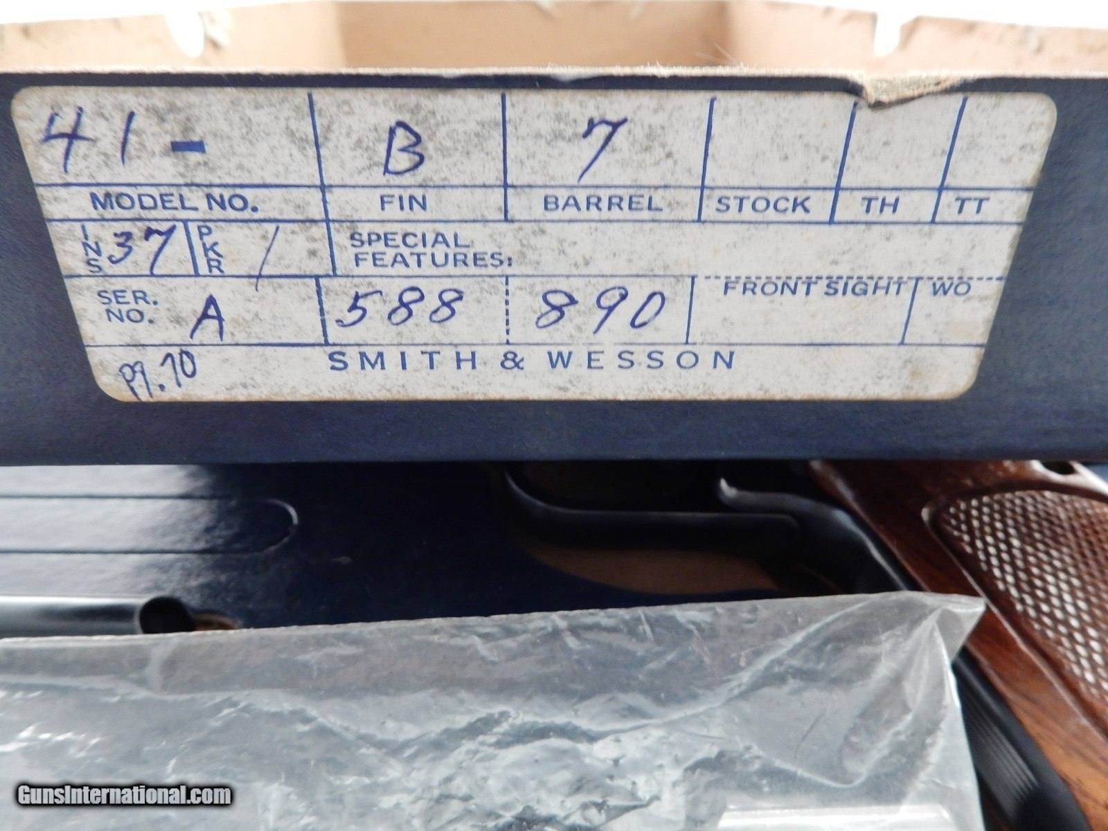 Description: This is a Smith Wesson 41 22 with a 7 inch barrel. This gun is 99% in the box. Serial # is A588xxx. Buyer pays 35.00 shipping. Thank you. 48-9-2 SOLD |