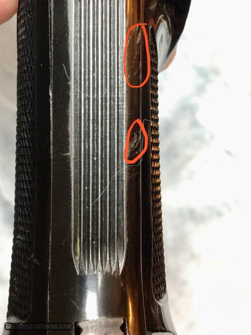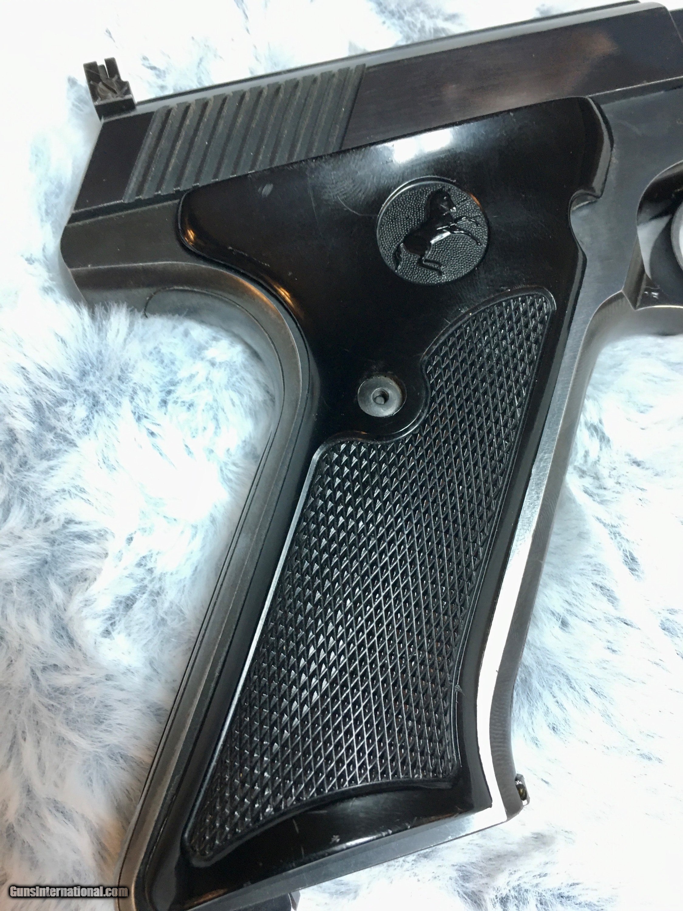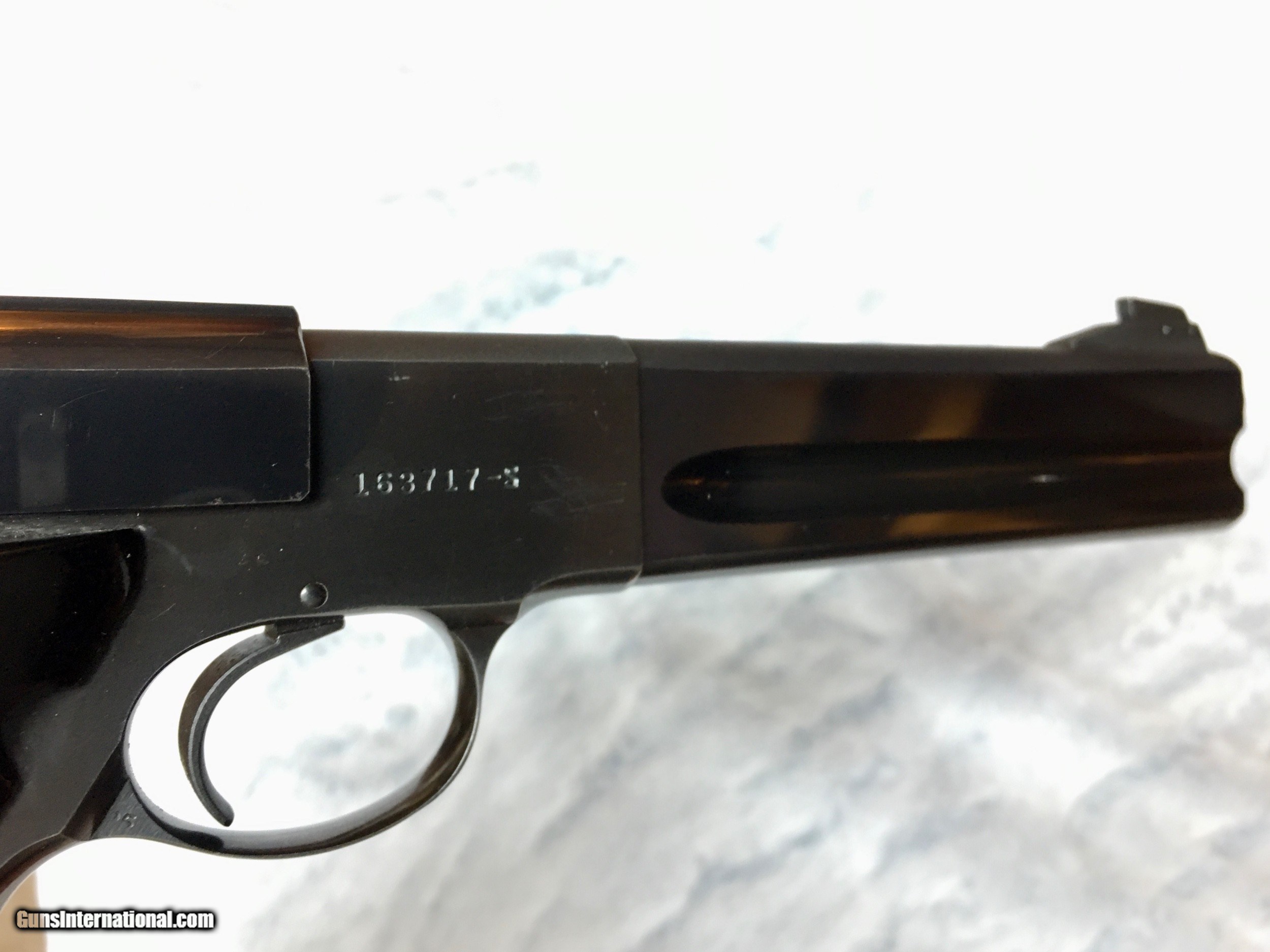 Description: This all-original Match Target Colt Woodsman, made in 1956, has the 6" heavy barrel, and black plastic grips. Grips are perfect and clean - no chips or scratches. Bluing is exceptional with only one very minor scratch on barrel and light wear on front of grip (see photos). One correct/original magazine but no box. **********Blue Star Hobbies is a group of friends in Central Illinois working together to ocassionally offer up items from our personal collections. From time to time we may list a rifle or shotgun but our focus is mostly S&W, Colt, & Ruger handguns built between 1946-1980. Our guns are better than our photography. We try to highlight flaws with red circles and everything else is usually glare or blanket fuzz. If you have a question about a photo please ask. We follow all Federal and State laws and GI policies. Please add $20 for standard shipping. Our FFL will ship to your FFL on Mondays, Tuesdays and Wednesdays to minimize in-transit risks. ********** SOLD Manufacturer: Colt Model: Woodsman Match Target Serial Number: 163717-S Caliber Info: 22LR Bore: Excellent Condition: 98% Metal Condition: 98% Finish: 98% Sights: Adjustable Manufacture Date: 1956 |