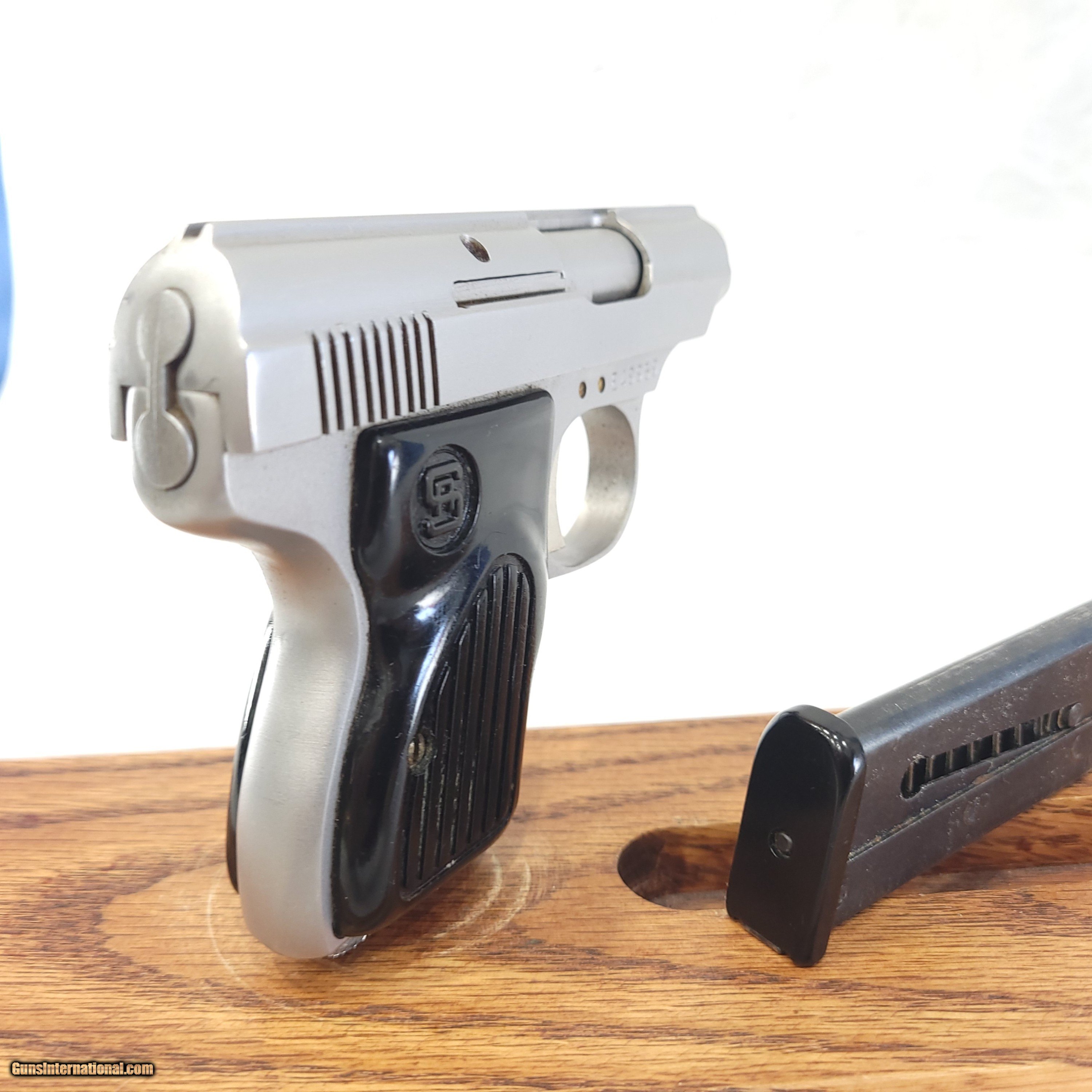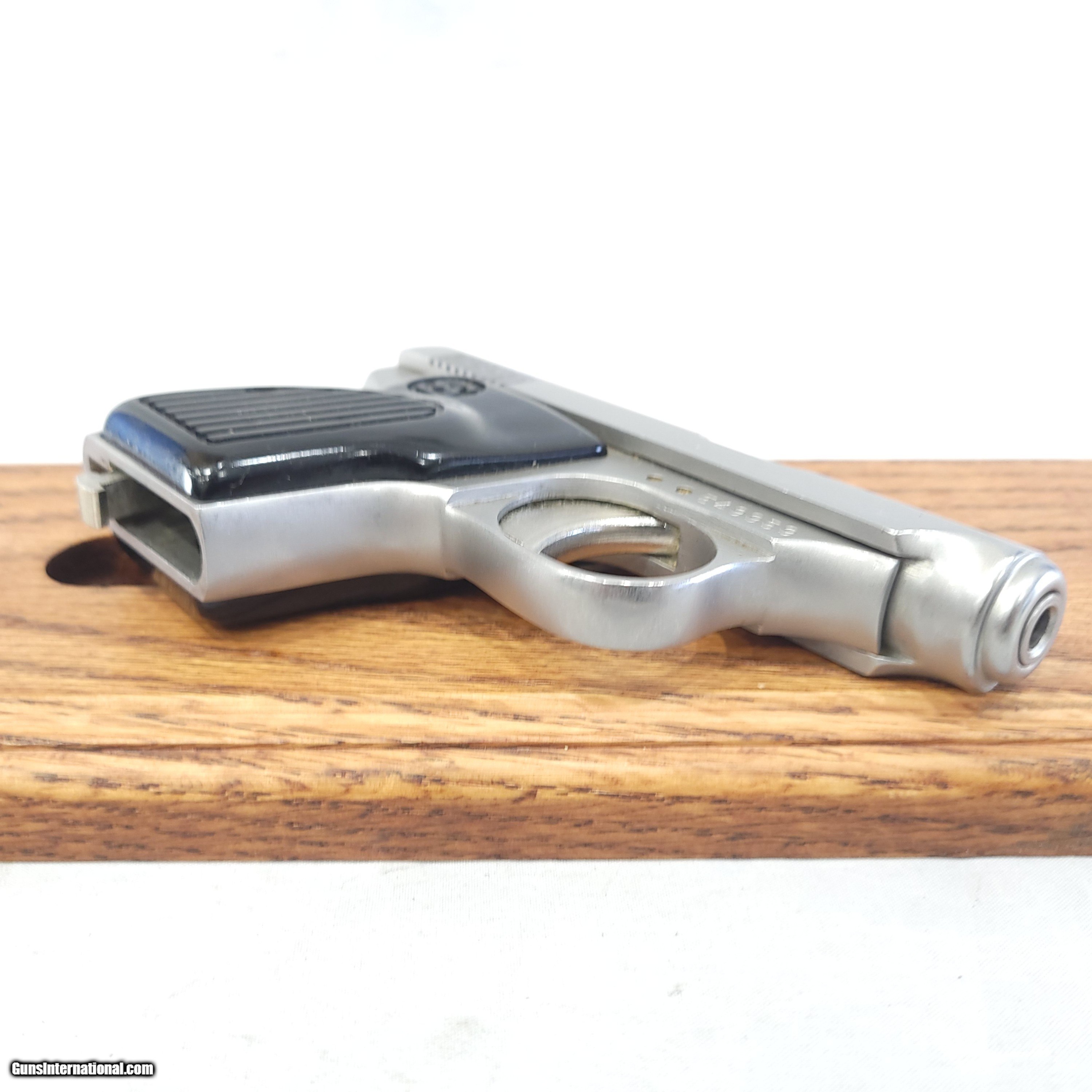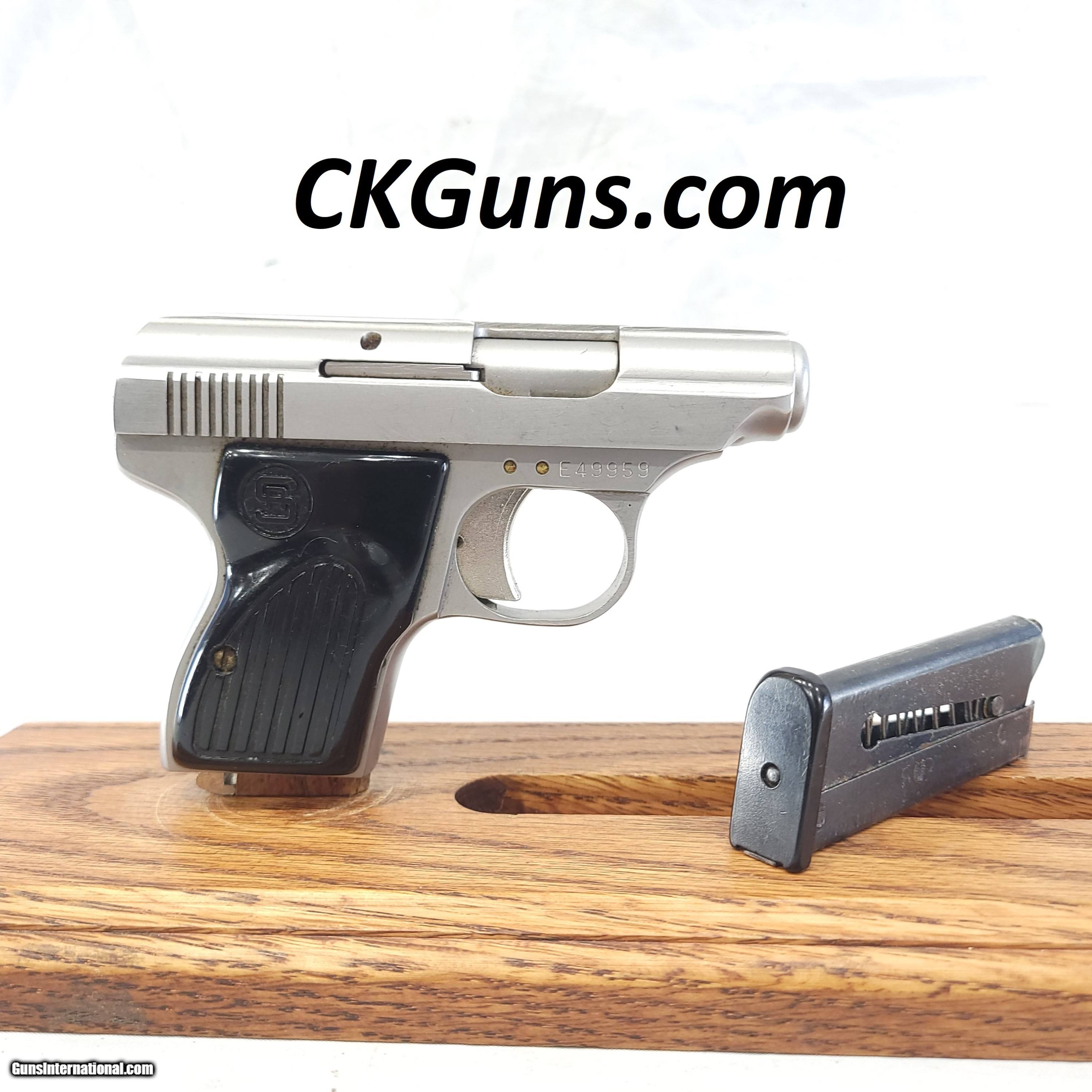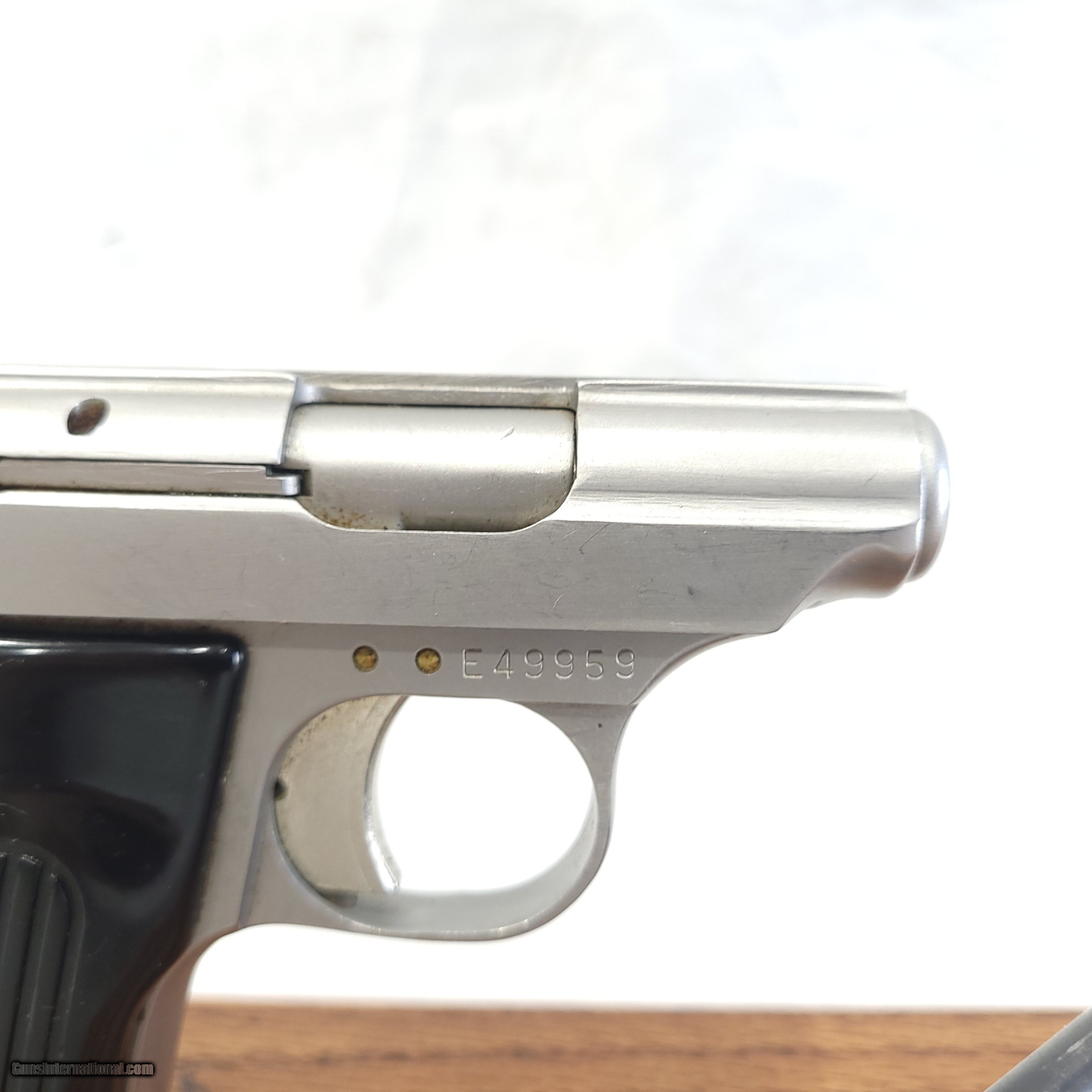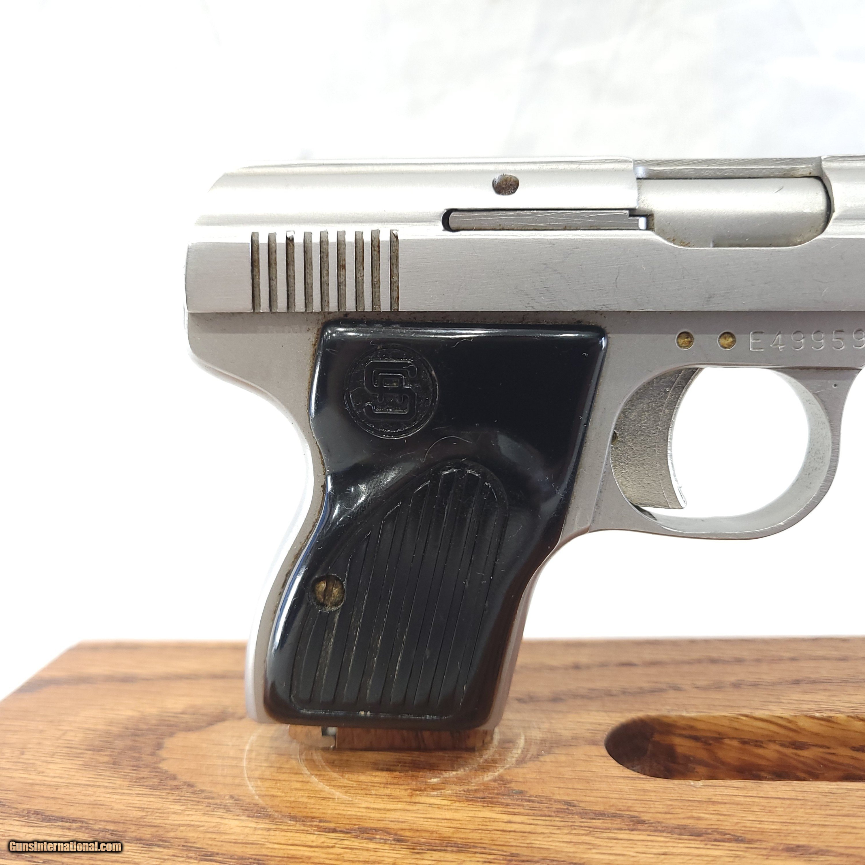Description: INV. 11467 ADORABLE STERLING MDL. STAINLESS PISTOL, CAL. .22 LR, SER. E49959. WHAT AN ADORABLE LITTLE GUN FOR YOUR CUTIE. THIS SMALL LITTLE GUN RETAINS ABOUT 99% OF THE ORIGINAL STAINLESS FINISH WITHOUT ANY STAINS, PITS OR BLEMISHES WITH ONLY ONE LITTLE SCRATCH ON THE TOP OF THE CHAMBER. THE BLACK PLASTIC GRIPS ARE ALMOST FLAWLESS WITH ONLY ONE TINYBENT ON ONE OF THE STRIATIONS ON THE RIGHT GRIP. ALL PARTS OF PRESENT AND NO PARTS ARE BROKEN. THE BORE IS BRIGHT AND SHINY WITH WELL DEFINED RIFLING. COMES WITH ONE ORIGINAL MAGAZINE. WHAT A GREAT GUN FOR THE SPECIAL PERSON IN YOUR LIFE OR FOR FUN AT THE CAMP. REASONABLY PRICED AT.... $249 To purchase this firearm or if you want to request more information contact us at: Email ckguns[at]ymail[dot]com Phone 201-512-0002 Cell 201-575-6838 FAX 201-215-4759 We accept most major credit cards. Prices shown are Discounted 3% for Cash or Check. The buyer must be familiar with all the laws governing the purchase and the ownership of firearms in their own city and state. The Yankee Armorer, Inc is not responsible for any failure to comply with or observe these laws. The Yankee Armorer, Inc will only ship after full payment and receipt of all required documents. Shipping: Add $35.00 for handguns, $45.00 for long guns. New Jersey buyers are subject to a 7% sales tax. The Yankee Armorer, Inc offers a 3 day inspection period with full refund upon return of intact firearm and in the original condition. The Yankee Armorer, Inc offers a no interest lay away program - 25% down; 25% in 30 days; 25% in 60 days; and full payment in 90 days. Any violation of this policy is subject to restocking and forfeiture of all payments. Any variation from this policy must be agreed to in advance. Unshipped Cancelled sales are subject to a 20% restocking fee. Be advised that all firearms sold by The Yankee Armorer, Inc. or the Gun Exchange, LLC (SELLER) are sold as collector’s items. They have not been fired or tested for safety and must be examined by a license gunsmith prior to use. By purchasing any item from the (SELLER), you are agreeing to hold the (SELLER) free from any damages or lawsuits of any nature. Any item left for transfer or storage will be charged to $25.00 per month, per item from the day of its receipt. Any variation from this policy must be agreed to in advance. Store hours 10:00 am to 5:00 pm Tuesday -Saturday. It's always best to call for appointment. Store 201-512-0002, cell 201-575-6838. SOLD |