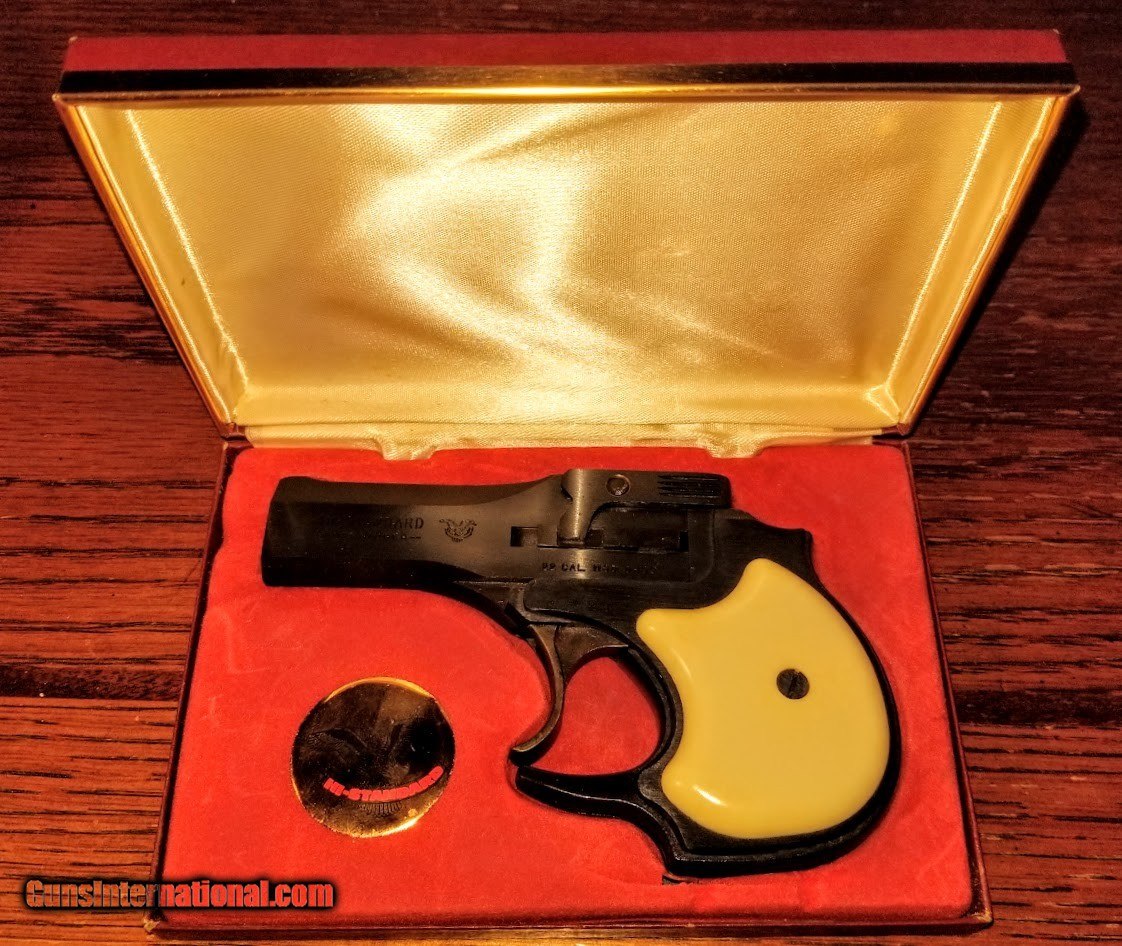 Description: Made in about 1965, this blued 2-shot derringer has ivory handles and comes in it's original box. This might make a great back up gun. Buyer pays shipping and insurance.Make an offer. SOLD Curio/Relic: Yes Rifle Caliber: .22 Long Rifle Handgun Caliber: .22 Long Rifle |