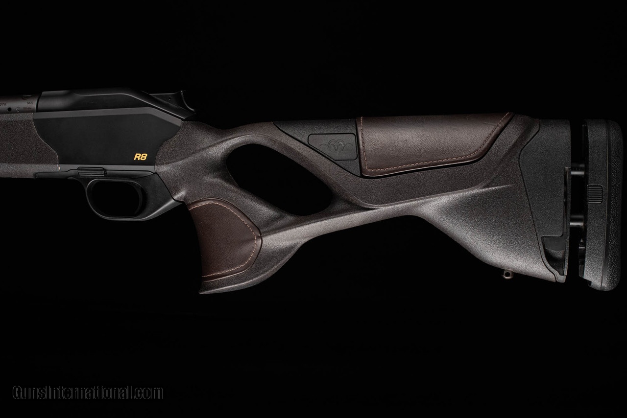 Blaser R8 Ultimate is a thumbhole stock with an adjustable cheek piece and the option to install their recoil absorbtion system also it has an adjustable buttstock. The stock is also has leather wraps on parts of the stock.