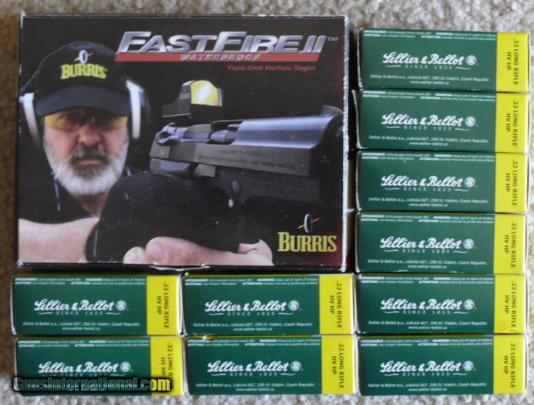 Description: TWO 10 RD. MAGAZINES AND 500 ROUNDS OF HIGH VELOCITY HOLLOW POINTS. Like new and in mint condittion. Less than 100 rds. fired. Not a scratch, ding or worn blue anywhere. 7.25 inch barrel - 38 oz. Aluminum frame and steel barrel. Burris Red is 100% optically and operational and 98% cosmetically. Brighthness automatically adjust for ambient light. Pistol also comes with factory pouch, original box and manual. The Burris II comes with factory tools, hood, manual and box. SHIPPING: $35 SOLD |