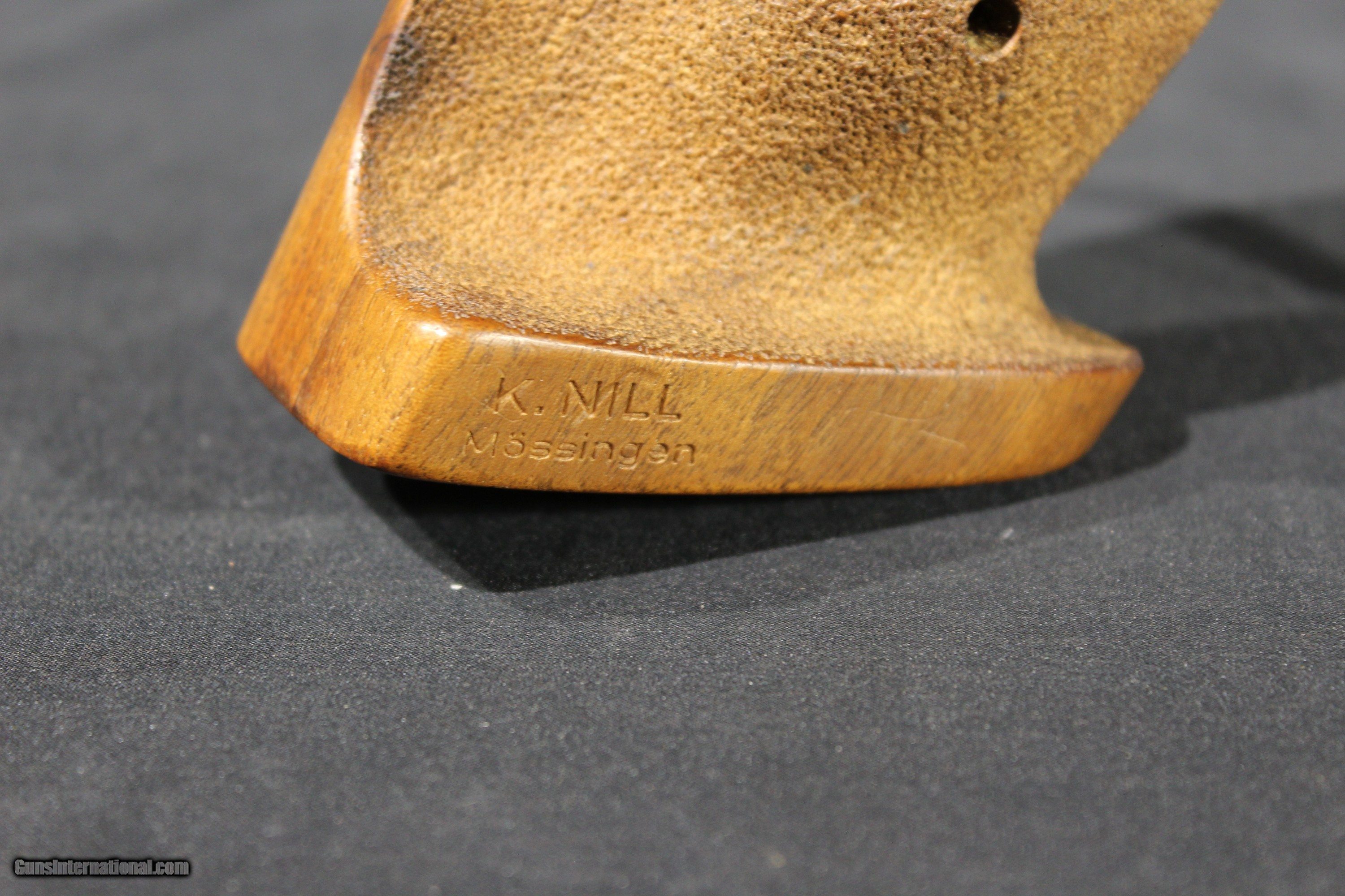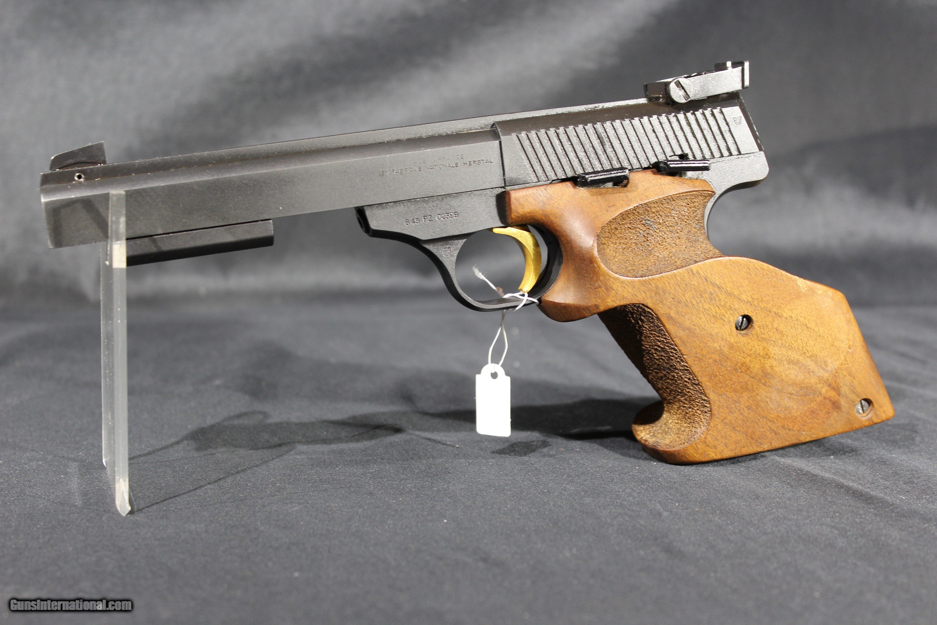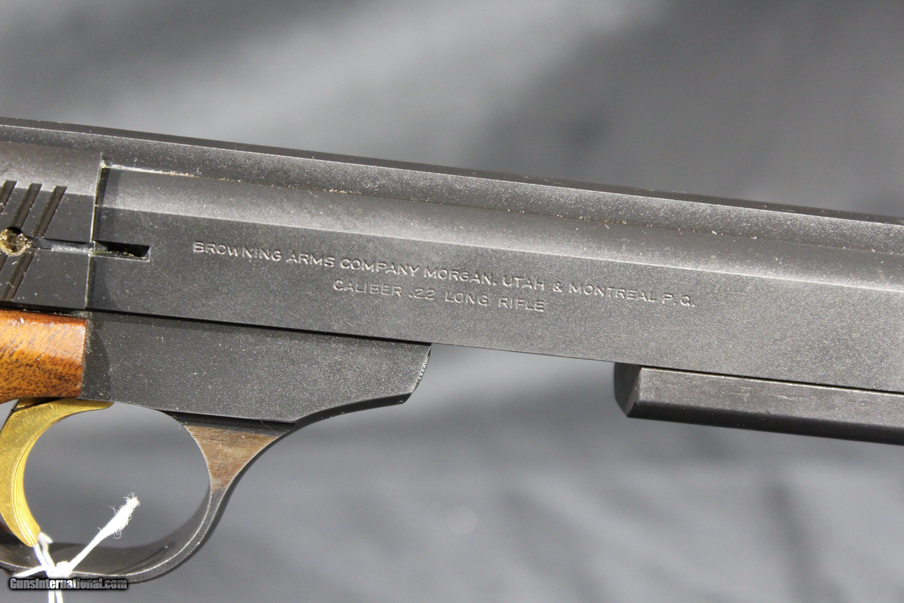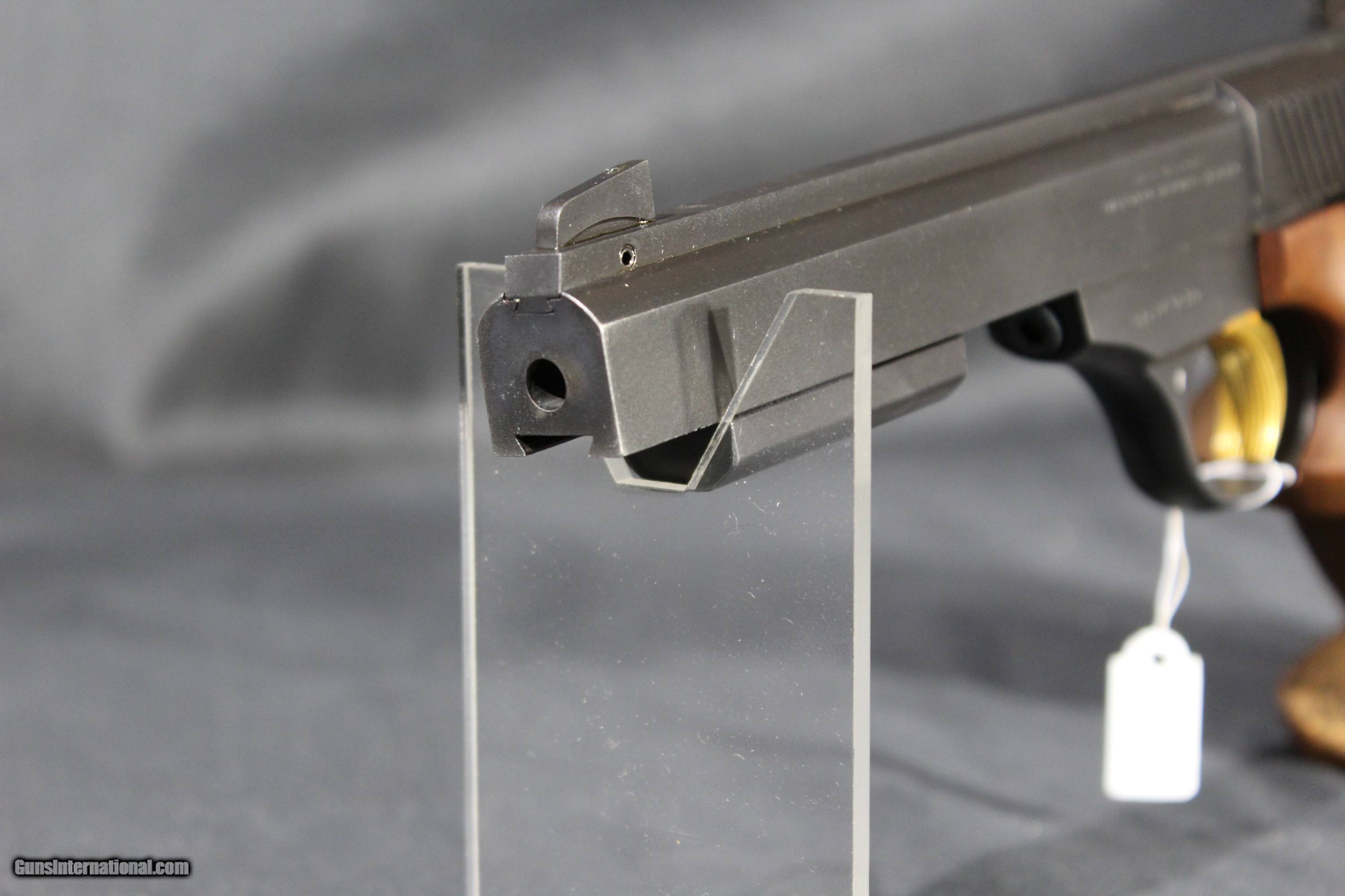 Description: Browning International II .22 Long Rifle Semi-Auto pistol . Features a 6-inch heavy match barrel with a large blade front sight and an adjustable u-notch rear. Removable weights are on the bottom of the slide. Factory matte blued finish. Gold-washed trigger. Adjustable walnut target grip. Includes a factory-blued steel 10-round magazine. K.Nill grips SOLD Handgun Caliber: .22 Long Rifle Manufacturer: Browning Model: International 2 Barrel Length: 6 Condition: Excellent Metal Condition: Excellent Wood Condition: Excellent Bore Condition: Excellent |