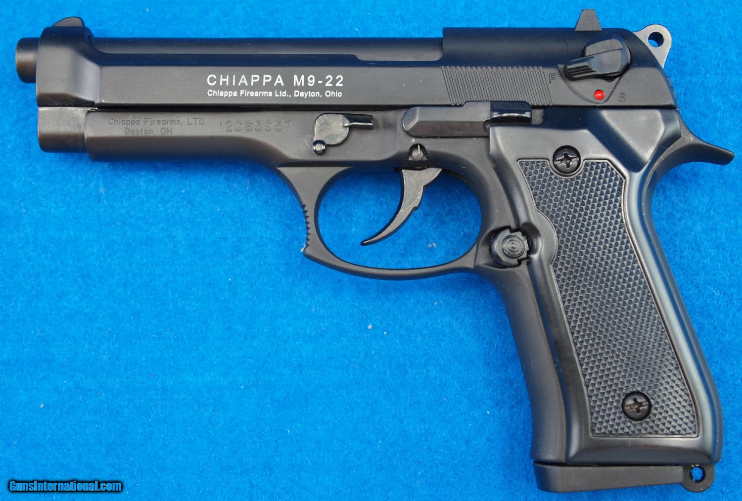 Description: CHIAPPA MODEL M9-22 .22 LR, 5 INCH BARREL, BLACK GRIPS, AMBIDEXTROUS SAFETY, AMBIDEXTROUS MAGAZINE RELEASE, LANYARD ATTACHMENT ON BOTTOM GRIP. S&H $25.00 C/C ADD 3% SOLD |