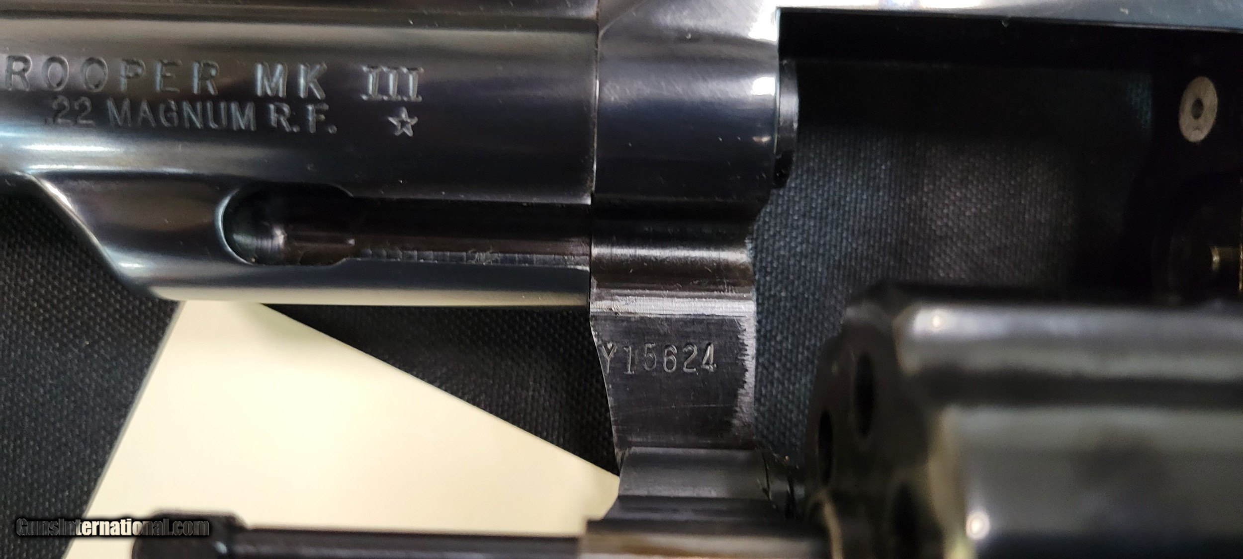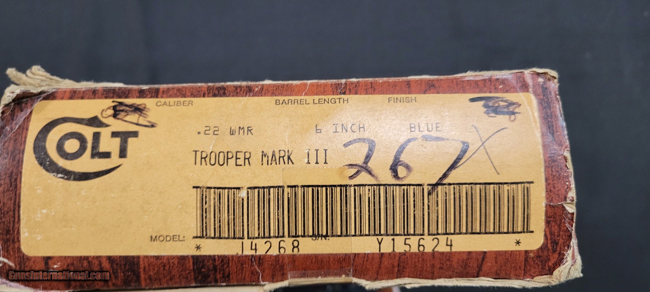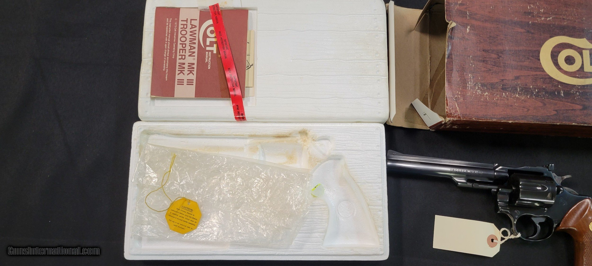 Description: Colt trooper mark III in 22 magnum with 6 inch barrel and in like new in box condition. Has correct box and manual and hang tag. Box has wear but gun is minty. This is a great collector peice. Shipping included in price. Gun was made in 1980 SOLD Handgun Caliber: .22 WMR (.22 Magnum) Manufacturer: Colt Model: Trooper mark III |