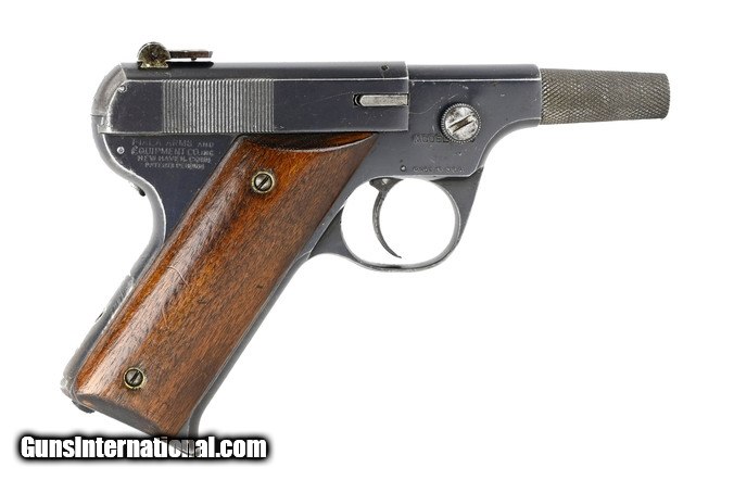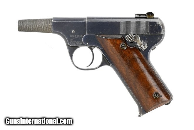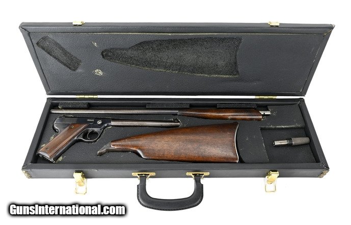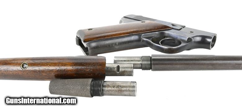 Description: Fiala Arms 1920 .22 LR caliber pistol. Fiala pistol with stock and 3”, 7 ½”, and 20” barrels in an after-market case. The .22 LR bores are excellent. The barrels, which are all unnumbered to the pistol, have approximately 95% blue finish. The smooth grips are fine. The screw-fastened buttstock is fine. The manually operated single shot action functions correctly. The left side of the frame is marked “Fiala Arms” above the image of a polar bear with trade mark, below that the right side has “Fiala Arms and/Equipment Co. Inc./New Haven, Conn./ Patents Pending”, “Model 1920” and “Made in the U.S.A.” are above the trigger guard. This interesting and unusual set belongs in any collection of early .22 Autos. Hard to find as a complete set!