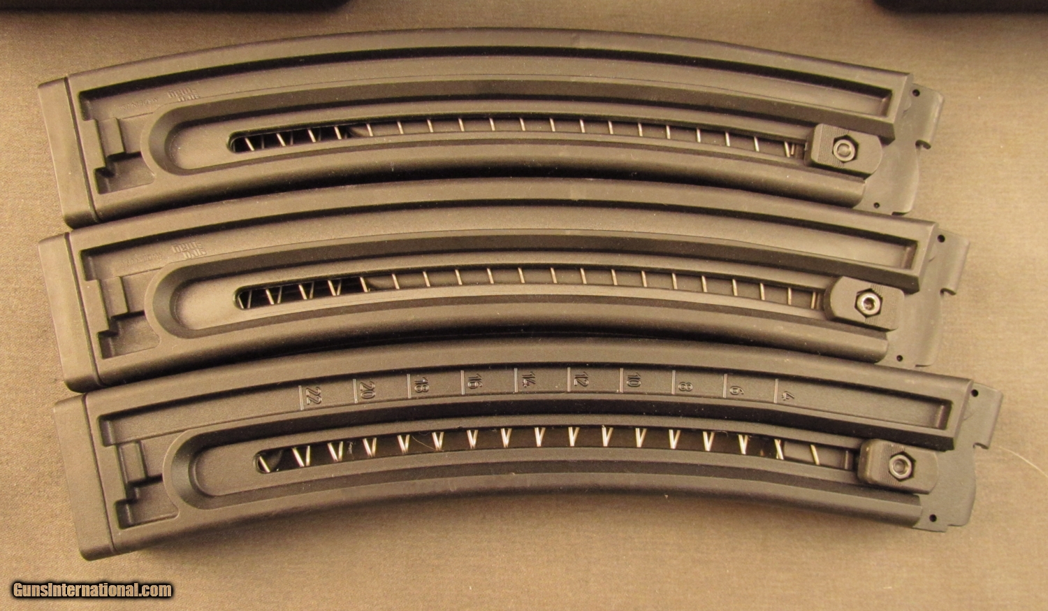 Description: Serial #A288903, .22 LR, 4 7/8” barrel with an excellent, bright bore. This neat semi-auto pistol is a 1:1 replica of the H&K MP5K submachine gun and is in virtually new condition with practically all of the original matte blue remaining on the metal as well as no discernible wear on the plastic components and furniture. The pistol is housed in its original black plastic case with papers, removable flash-hider, triggerlock, tools, and three magazines. This is a great looking pistol and is in almost new-in-box condition. SOLD Manufacturer: GSG Model: 5 Serial Number: A288903 Caliber Info: .22LR Gauge Info: .22LR |