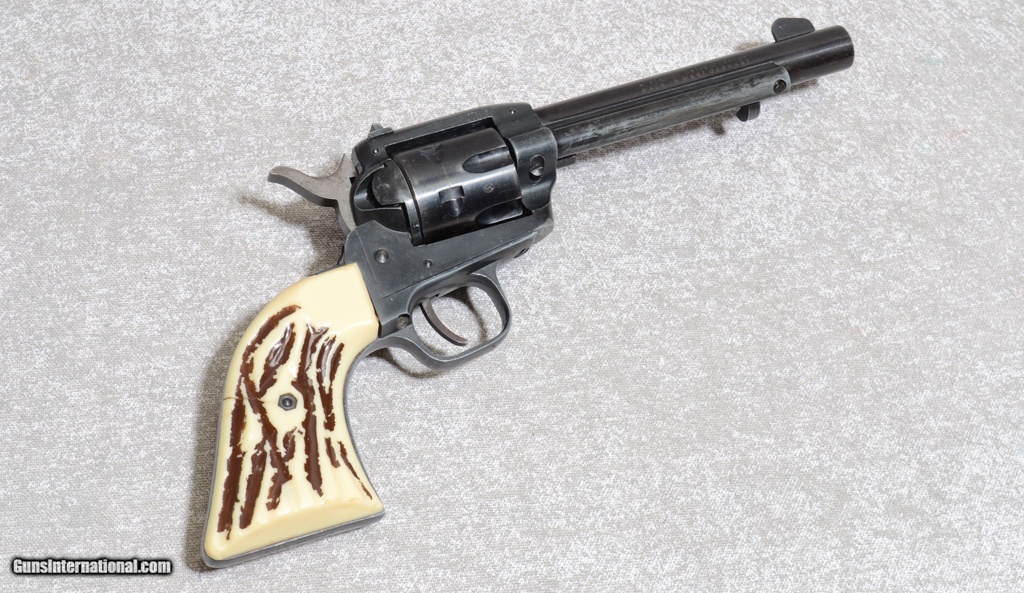 Description: The Herbert Schmidt Model 21S is a small, single-action, six-shot revolver made in West Germany (H. Schmidt/Ostheim) and commonly encountered in .22 Long Rifle for with an extra .22 Magnum cylinder to give owners a dual-caliber rimfire option. It's a Colt-Peacemaker-style rimfire trainer rather than a modern duty piece. Does come with (1)-.22 Magnum Cylinder and (1)-.22 LR Cylinder. .22 Long Rifle Metal Condition: Fair Condition with Some Bluing Wear and Surface Pitting Wood Condition: Plastic Grips in Fair Condition with a Crack and Yellowing of Plastic Barrels: 5.5 Inch Barrel Triggers: Single Action Weight: 2 1/4 lbs Sights: Bladed Front Sight with Fixed U-Notched Rear Sight Item Location: Tulalip, WA Price: $159.99 Contact Seller |