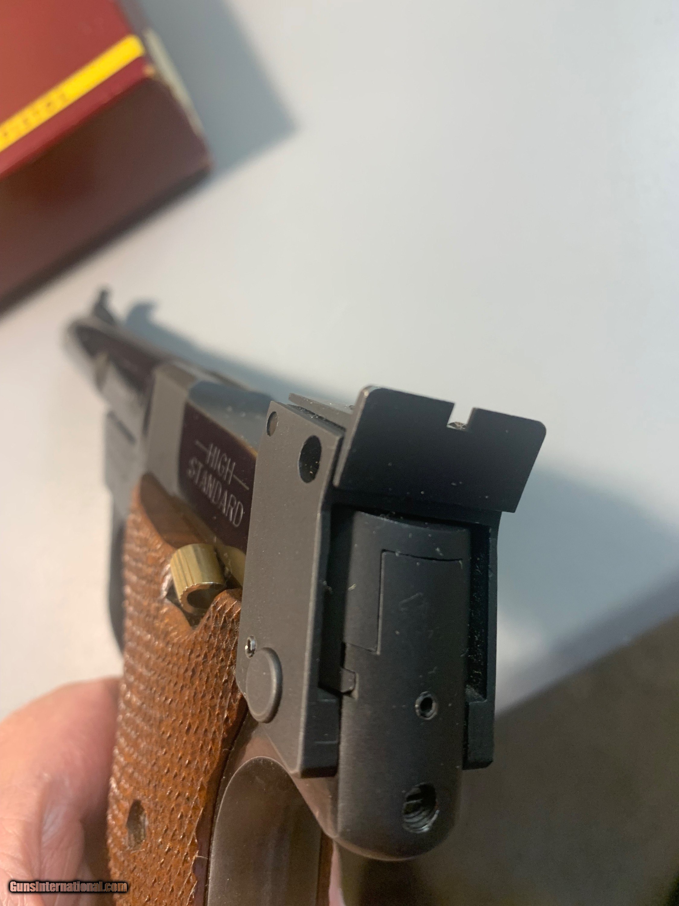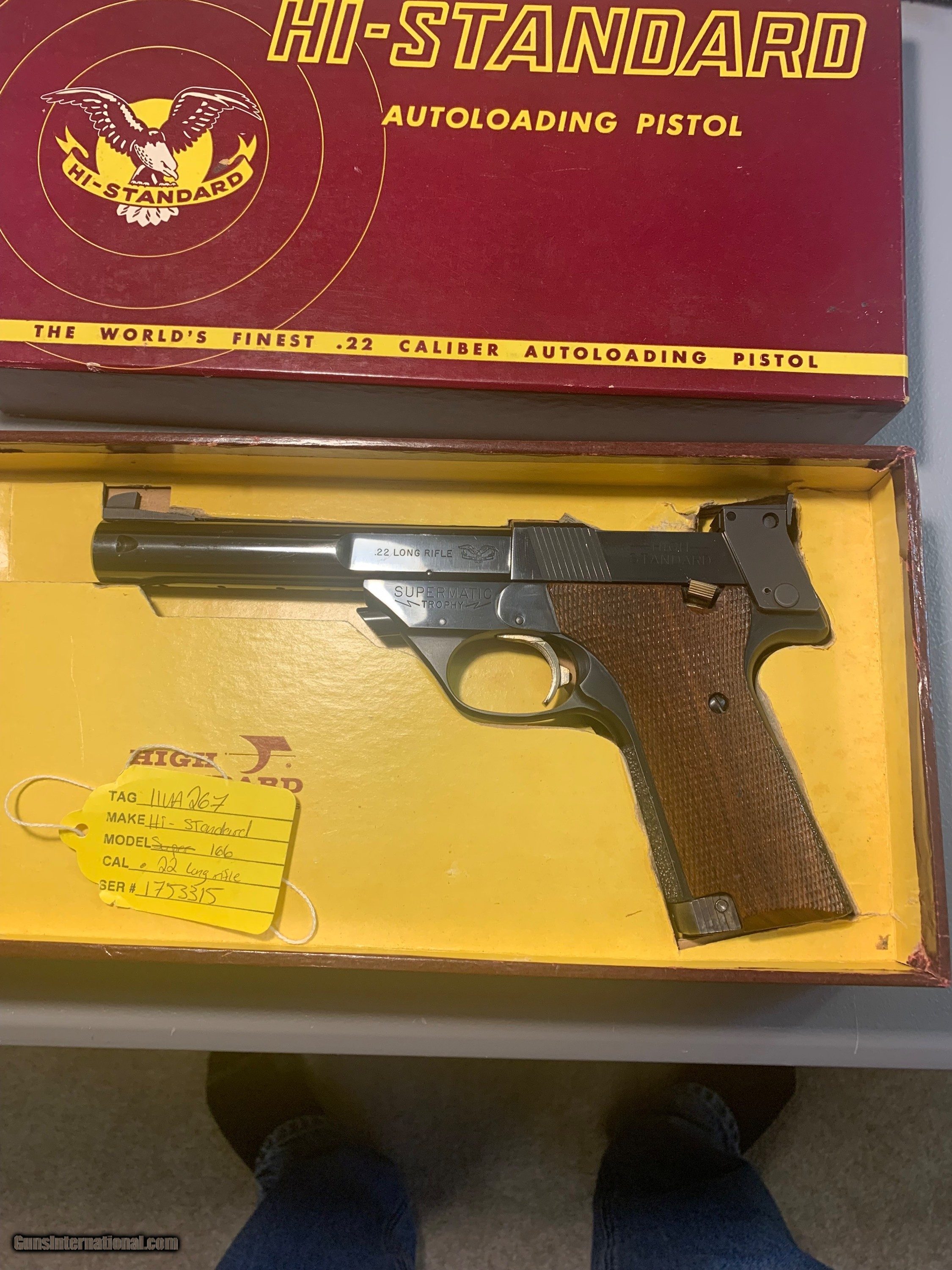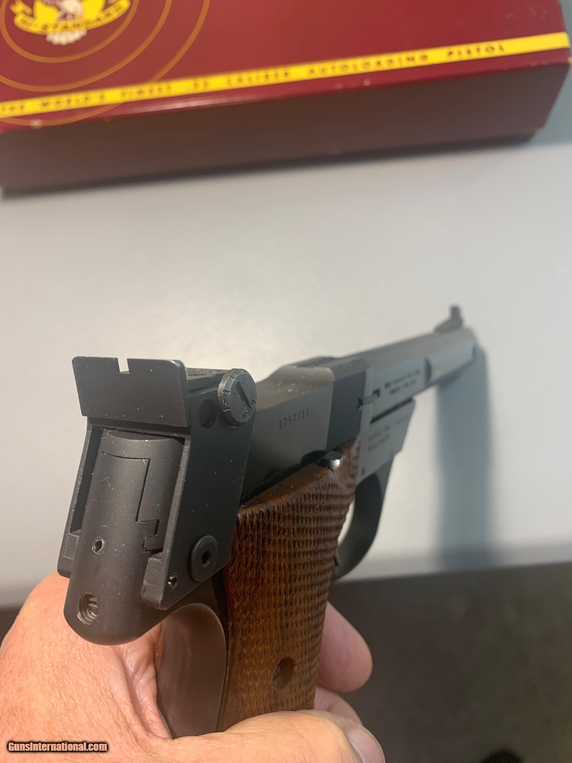Description: Have for sale Beautiful High Standard model 106 Supermatic Trophy L.N.I.B. Never fired, original box, wood grips has sharp checkering, Blue is Pristine with light handling marks, has very light wear on both sides of barrel towards rear likely from box wear , otherwise I would rate overall condition at 98% or better, Bore , Breach action all Perfect !! Comes with original box, one original 10rd. Mag. No paperwork. Can pay with USPS Money order , Bank Cashiers or Money order along with copy of your FFL to be sent to , ok thank you for looking. Handgun Caliber: .22 Long Rifle Manufacturer: High Standard Mfg. Model: M106 Barrel Length: 5 -1/2 inch. Bore Info: Perfect Chambers: Perfect Ejectors: Perfect Condition: Minty Metal Condition: Excellent Wood Condition: Perfect Bore Condition: Perfect Action: Semi Auto Triggers: Gold Target Rib: Multiple Ribbing top of Barrel Finish: Dark Blueing Sights: Adjustable Targets Manufacture Date: 1967 Item Location: Spokane,wa. Grips: Wood Walnut Optic: Open Price: $895.00 Buy Now Contact Seller |