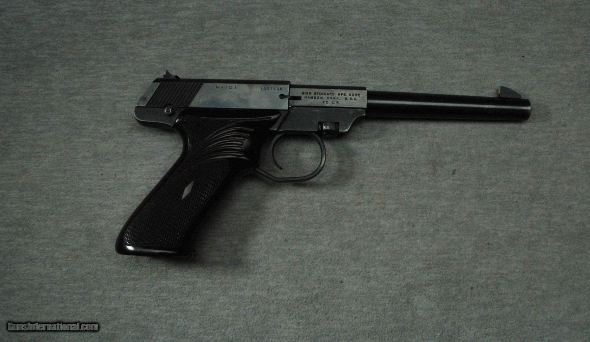 Description: High Standard M-101 Dura-matic chambered in .22 Long Rifle. This pistol was produced from 1954 to 1970. It has a thumb nut take-down. It features a 6 1/2-inch barrel with a fixed sight. It is in excellent condition with a bright bore. Includes 1 mag. No box. .22 Long Rifle Metal Condition: Excellent Bore Condition: Bright Barrels: 6 1/2 Inches Triggers: Factory Weight: 2 lbs 4 oz Sights: Fixed Item Location: La Vista, NE Price: $399.99 Contact Seller |