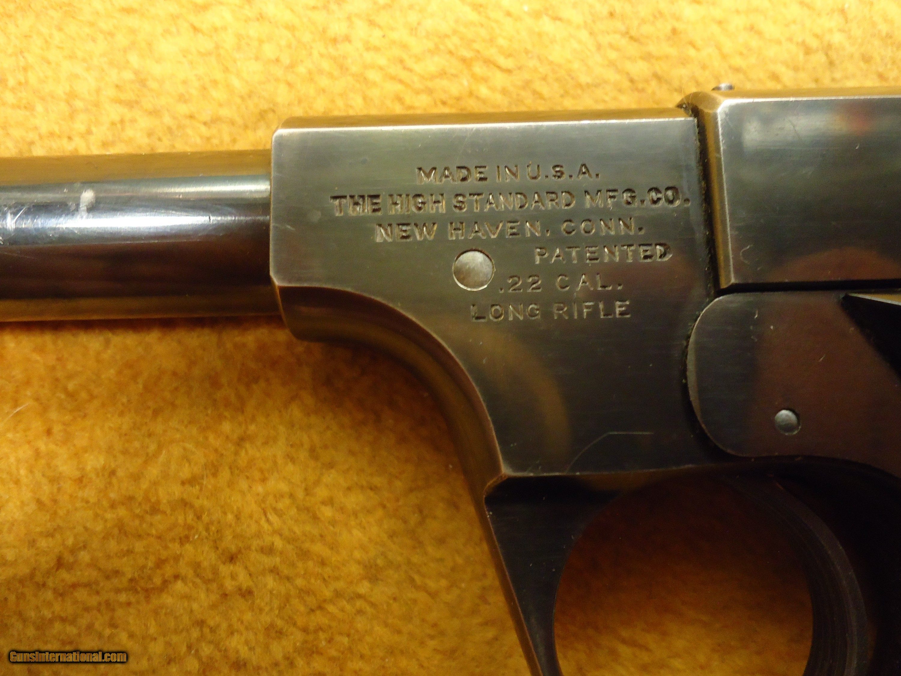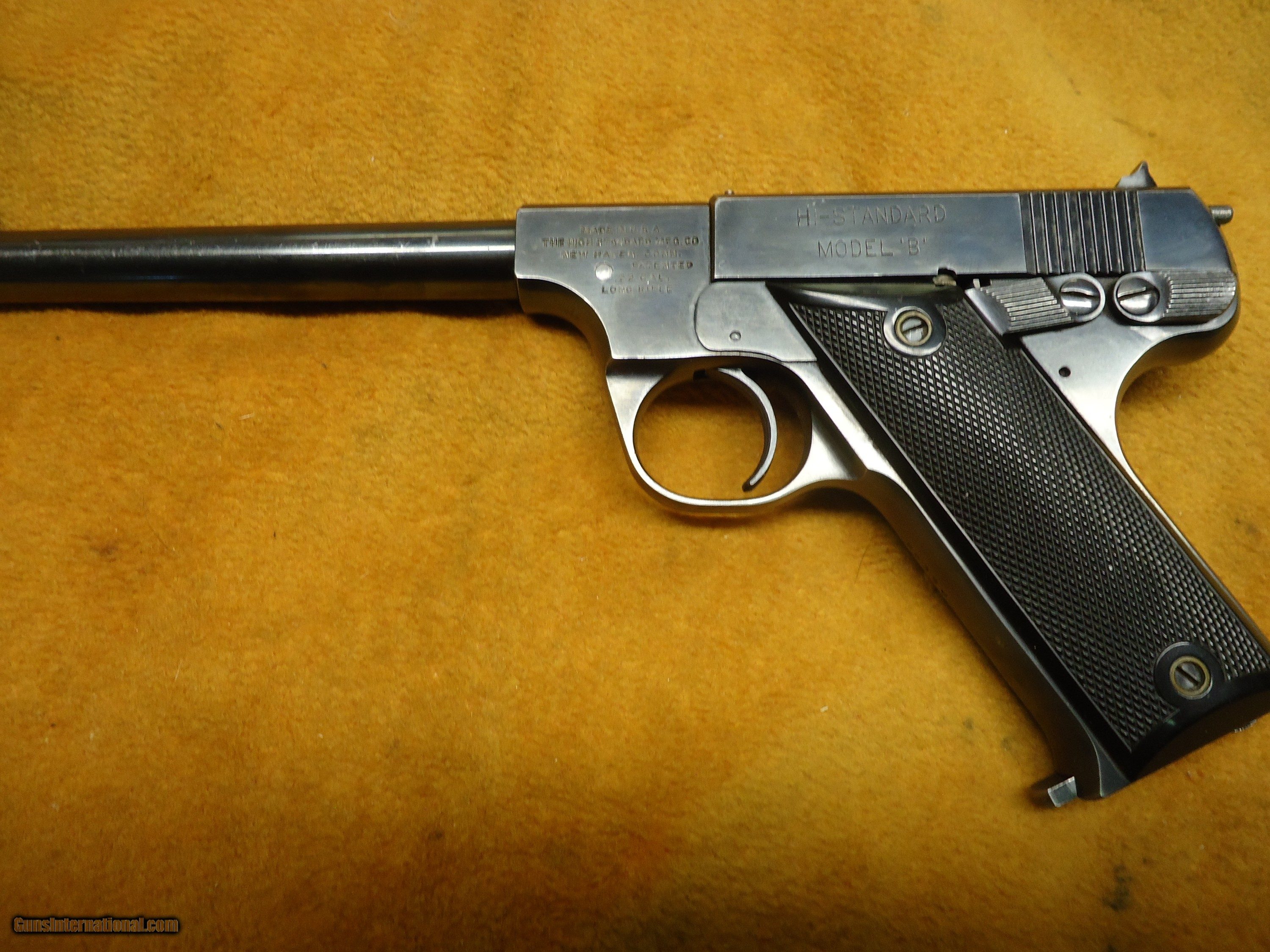 Description: High Standard Model "B" 22Long Rifle. A collectors pisto; 98%. SOLD Curio/Relic: Yes Handgun Caliber: .22 Long Rifle Manufacturer: High Standard Model: Model B Serial Number: 28396 Barrel Length: 6 3/4 Condition: 98% Metal Condition: Near Perfect Wood Condition: perfect Bore Condition: perfrct |