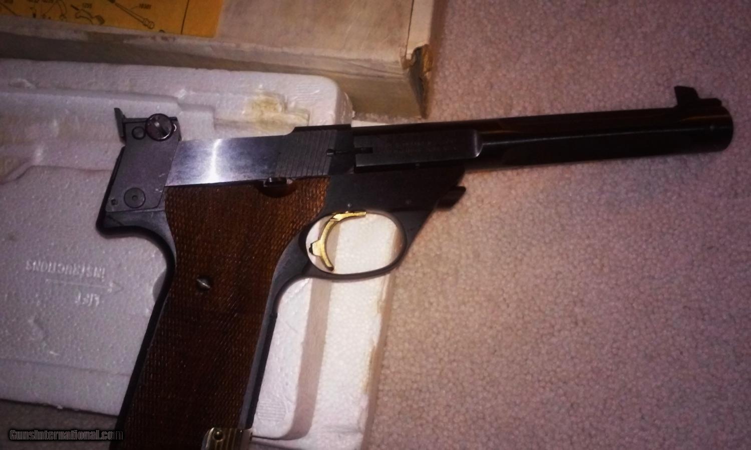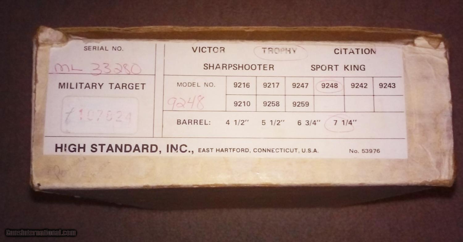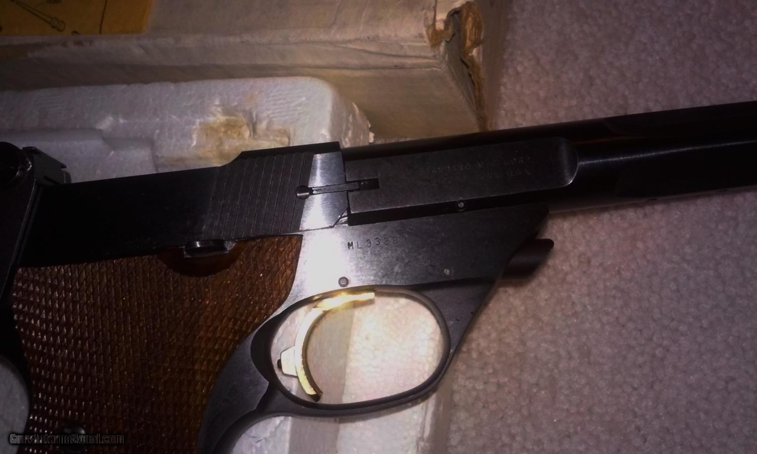 Description: High Standard Military Trophy Pristine NEW IN BOX condition UNFIRED beautiul fluted 7 1/4" barrel. 1977 ML series.Original box match to gun. A no excuse gun- find one cleaner! Make an offer! Money order 35.00 Shipping SOLD Manufacturer: Hi Standard Model: Military Trophy Caliber Info: .22 |