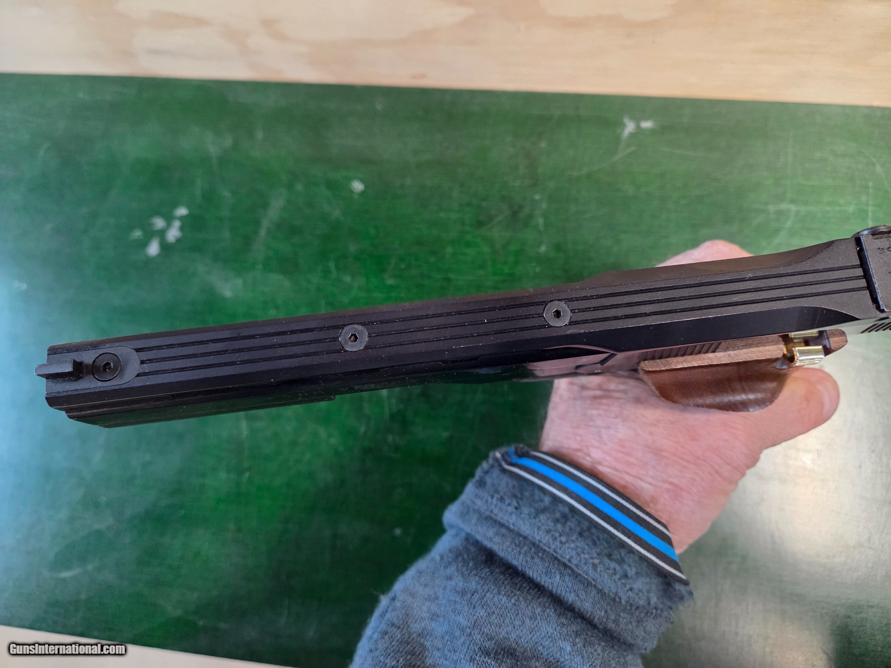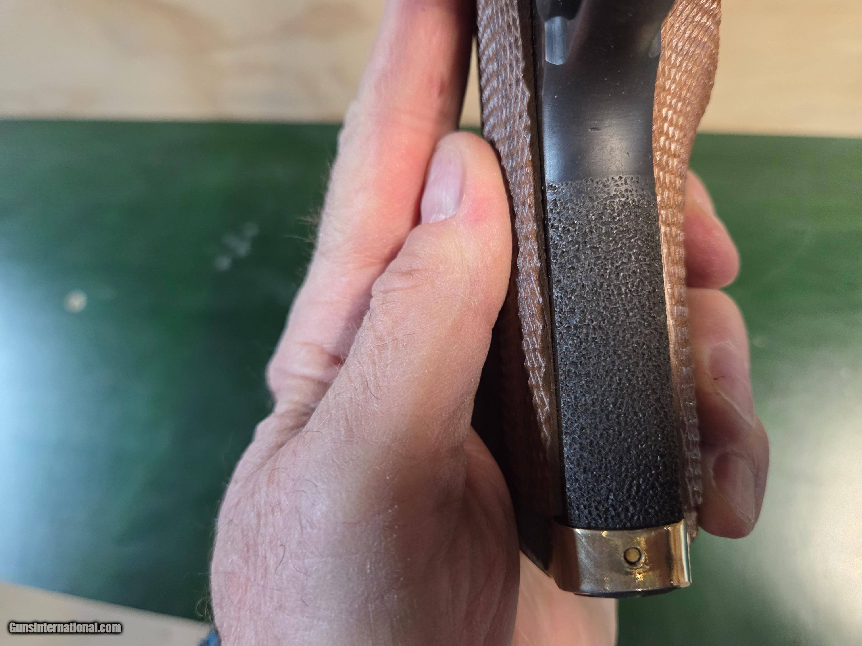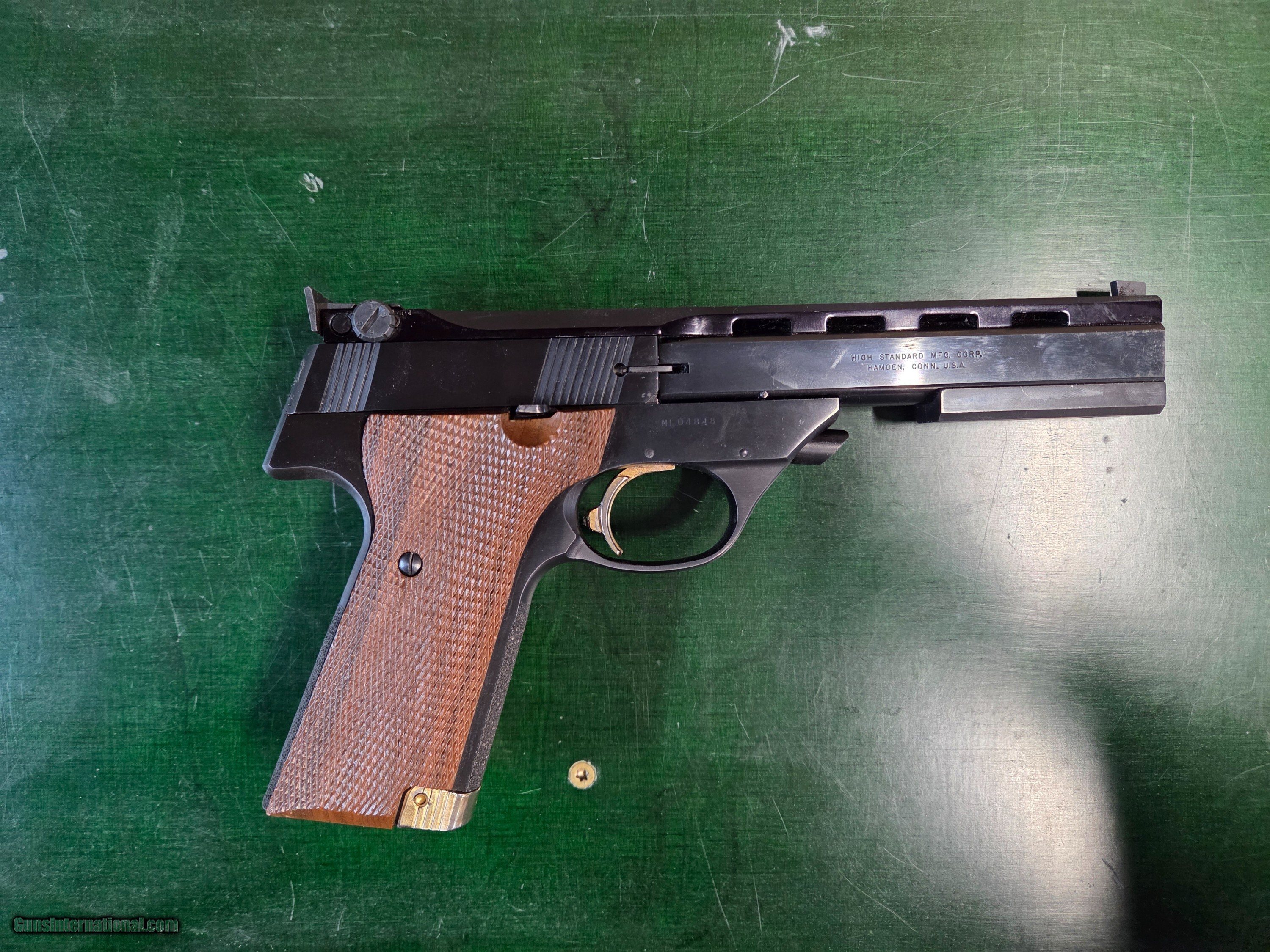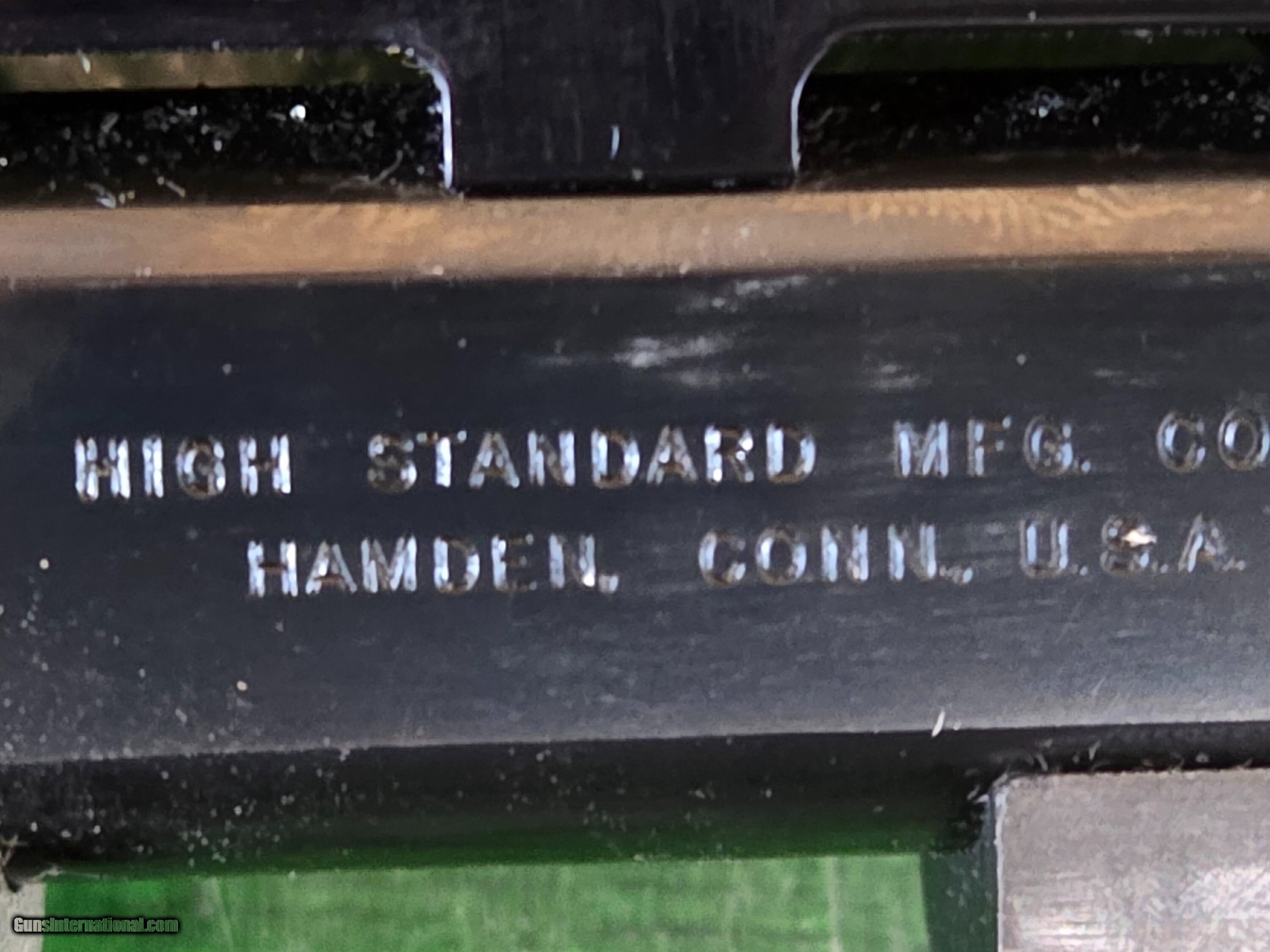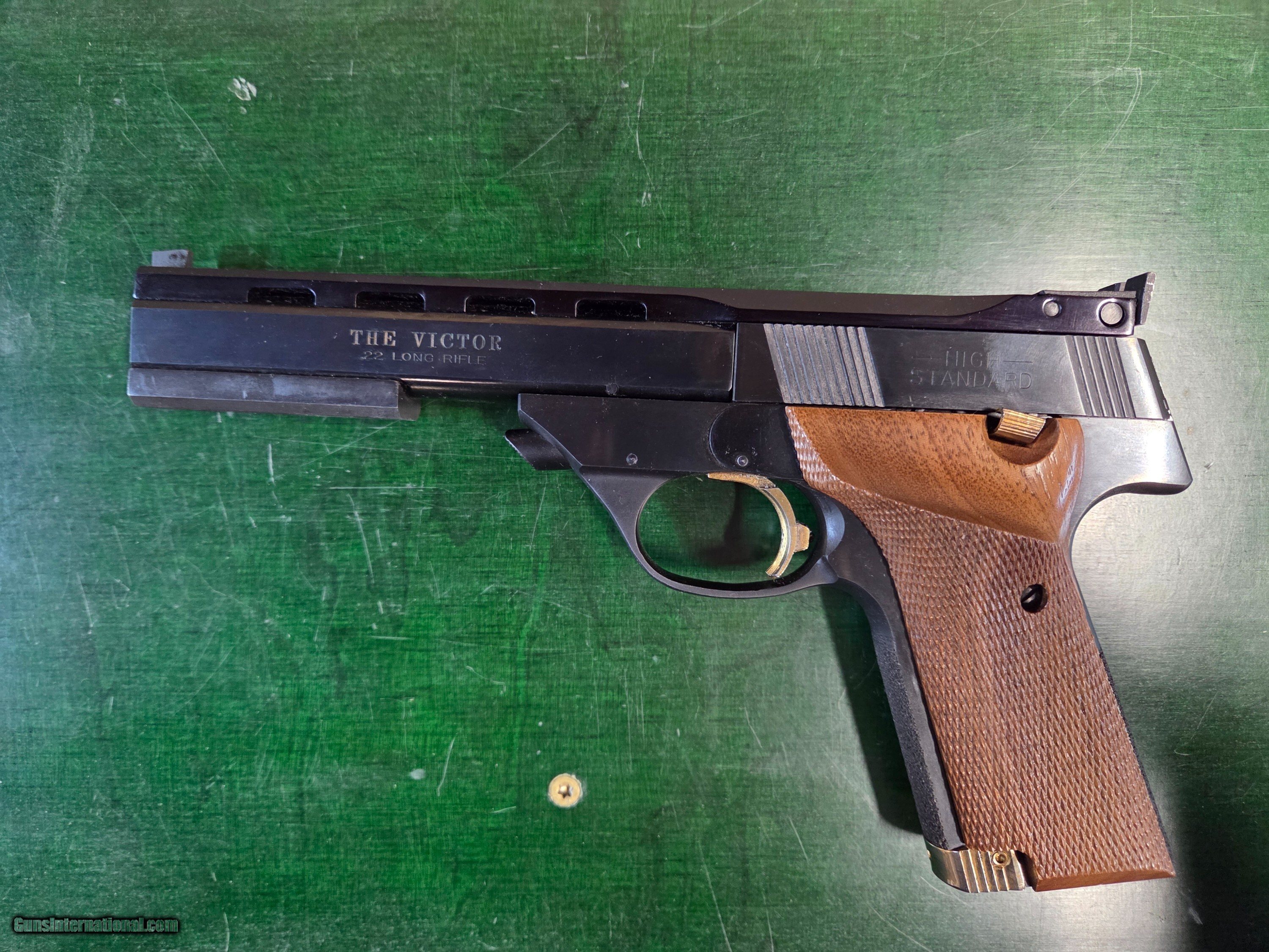 Description: High Standard - The Victor. catalog # 9217. Series 107 early serial number ML 04848 made in Hamden CT. 5.25" Barrel. Vented aluminum rib, barrel weight, push button take down, 2 extra magazines, checkered walnut grips with thumb rest (right handed). Of the three magazines, 2 are etched with the gun's serial number. No box. Like new condition. $950 plus $60 for shipping and transfer. Handgun Caliber: .22 Long Rifle Manufacturer: High Standard Model: The Victor Serial Number: ML 04848 Barrel Length: 5.25 Condition: like new Metal Condition: 100% Wood Condition: 100% Bore Condition: 100% Rib: vented aluminum Grips: checkered walnut Price: $950.00 Shipping: $60.00 Contact Seller |