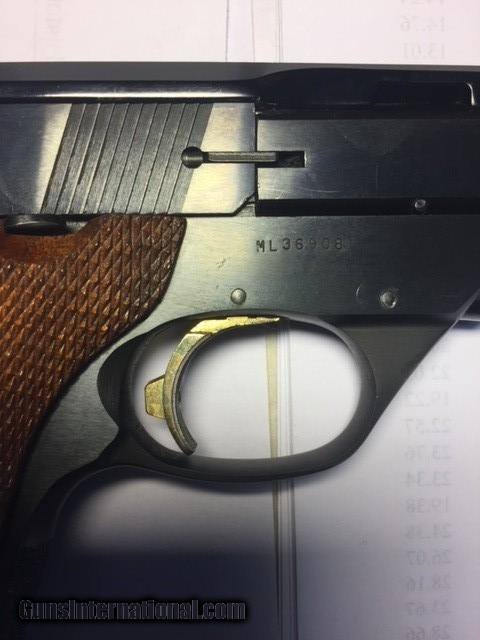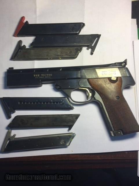 Description: High Standard ~ Victor ~ .22 LR Description: High Standard Victor Pistol, .22 LR. Excellent condition, light finish wear. Rimfire target pistol with ribbed heavy barrel, adjustable sights, removable weight and target grips. .22 Long Rifle Price: $749.99 Chambers: Semi-auto Metal Condition: Very Good Wood Condition: Grips are excellent- (Left Grip filed down for Left Hand Use) Bore Condition: Bright Barrels: 5 1/2 Triggers: Serrated target trigger Butt Pad: Wood target grips Sights: Adjustable iron sights Magazine: 6 Included Item Location: Cape Coral, FL SOLD Manufacturer: High-Standard Model: The Victor Serial Number: ML 36908 Barrel Length: 5-1/2 Condition: Very Good Bore Condition: Bright |