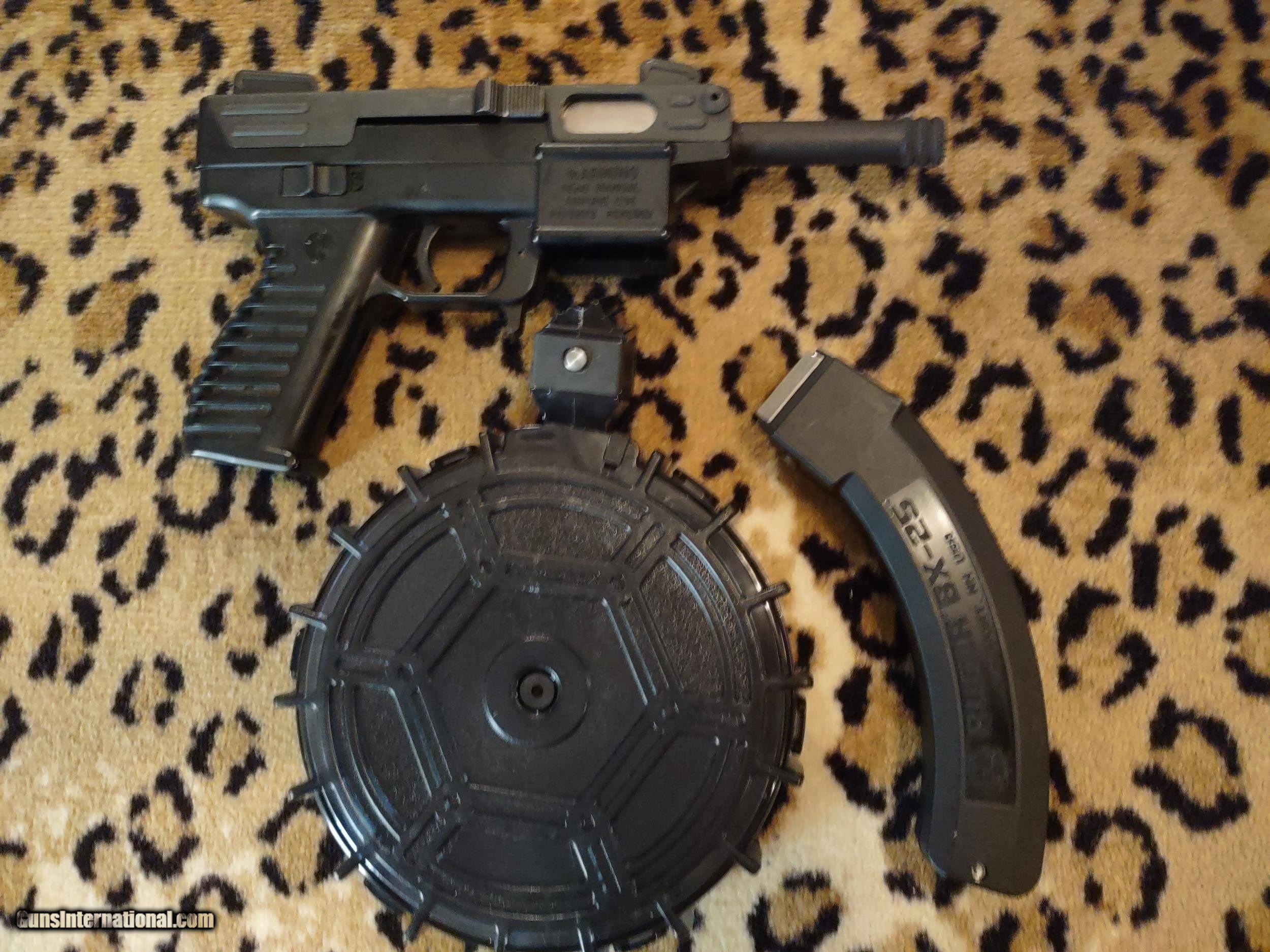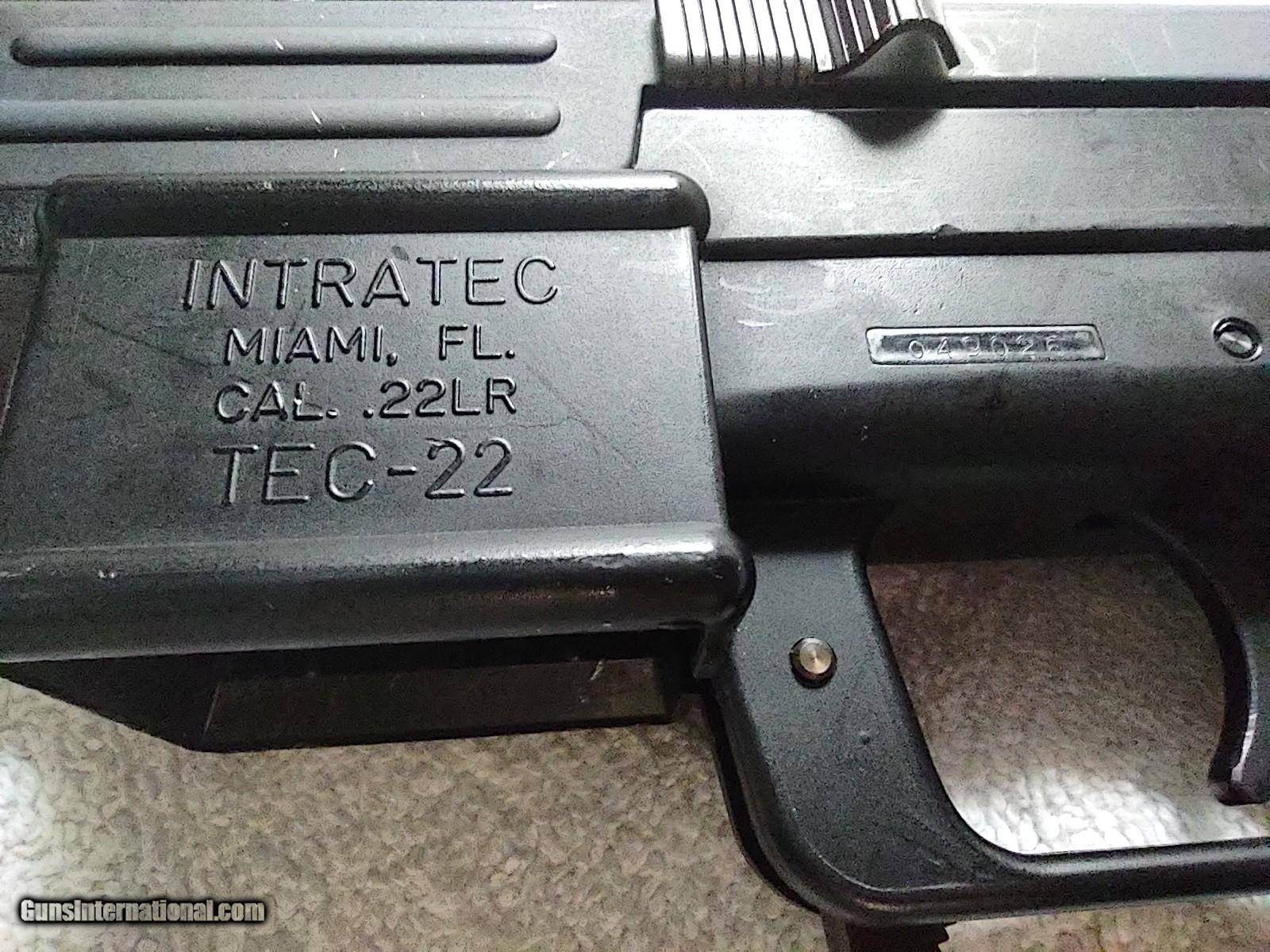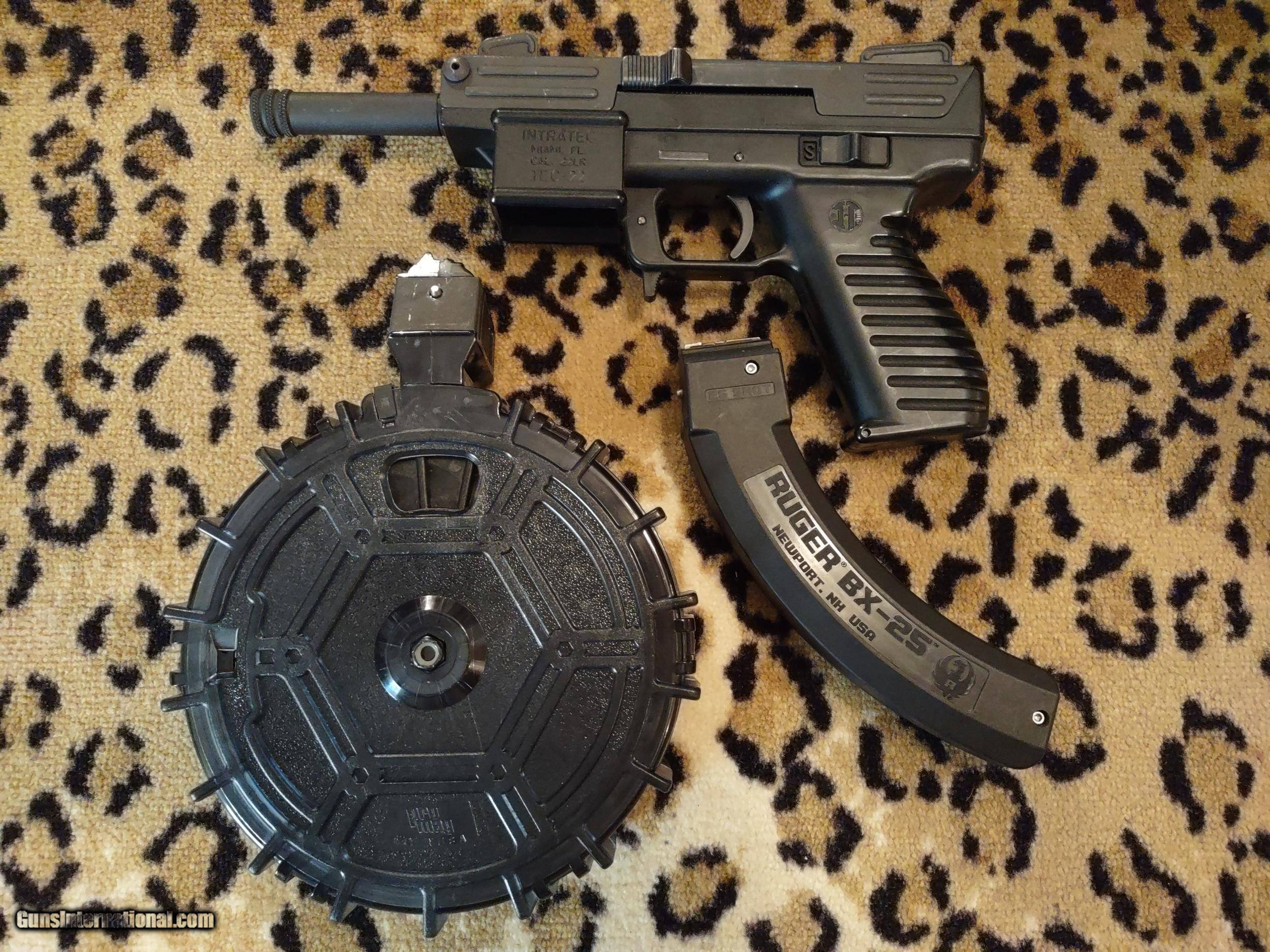 Description: INTRATEC TEC-22 semi-automatic tactical pistol in .22LR caliber with 3 3/4" barrel (threaded) with bright glossy bore, Ruger BX-25 25-round banana magazine and PROMAG 100-round drum all in flawless condition, all black, like new! Pistol has ambidextrous safety and bolt slide, fixed sights with sight guards and storage compartment in grip for parts and accessories. This great pistol is inexpensive to shoot plus lots of fun, very accurate and fires as fast as you can pull the trigger. The price is $800 including UPS shipping to the FFL dealer near you. Call or text me at 318-780-4242 if you are interested. THE DRUM IS VERY EASY TO LOAD AND UNLOAD!! SOLD Manufacturer: INTRATEC Model: TEC-22 Serial Number: 049026 Barrel Length: 3 3/4", threaded Bore: bright and glossy Chambers: Excellent Ejectors: Semi-automatic Condition: Excellent Metal Condition: Excellent Wood Condition: No wood Bore Condition: Excellent Barrels: Single Barrel Type: Pistol Action: Semi-automatic Triggers: Single Finish: Black Sights: Fixed, open Manufacture Date: Not sure Engraving: Magazine and drum Case: Hard polymer carry case Item Location: Shreveport, Louisiana |