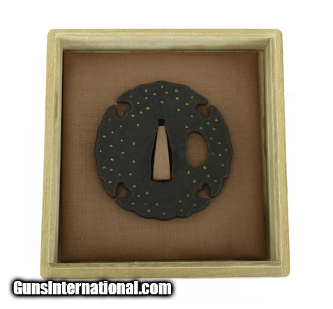 Description: Iron Tsuba. Striations and brass inlay. Onin style. Unsigned. Boxed. Vertical height 2 5/8” (6.9cm). SOLD |