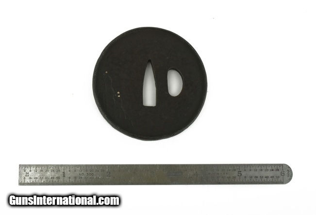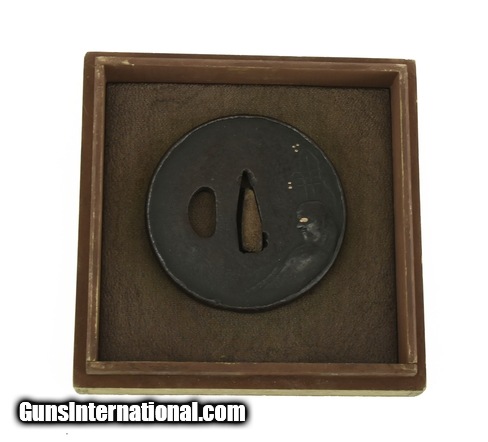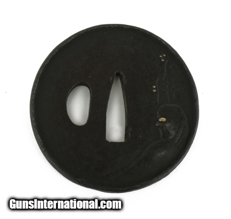 Description: Iron Tsuba. Motif of Daruma with gold highlights. Signed: Yasu Chika. Raised rim. Boxed. SOLD |