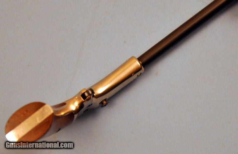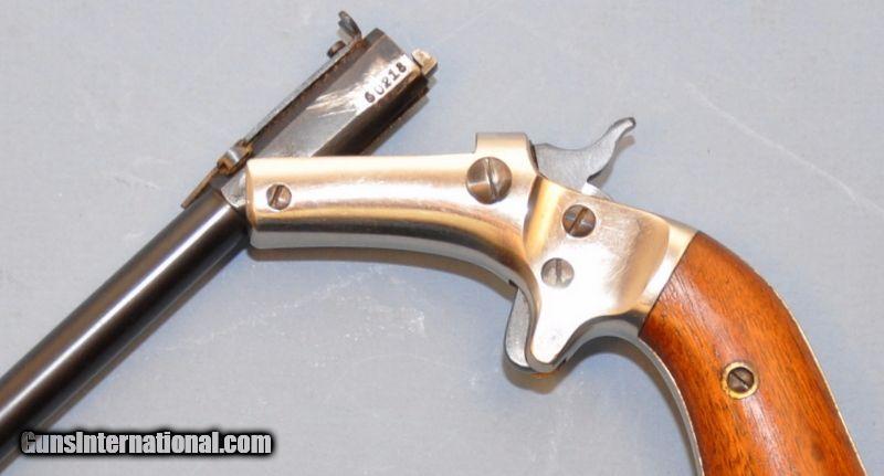 Description: .22 S,L. Serial number 602XX. 6" barrel with bead front & adjustable V-notch rear sight. Nickel finished spur trigger action. 2 piece walnut grip. Bbbl retains over 90% slightly dulled blue. 98% nickel showing small scratches. Grips show scattered handling marks. Sound mechanics. Bore is generally bright with intact rifling with scattered pitting. Shipping to FFL or C&R $20.00 SOLD Curio/Relic: Yes |