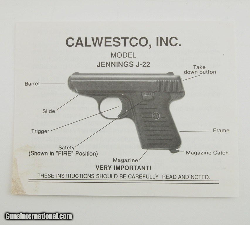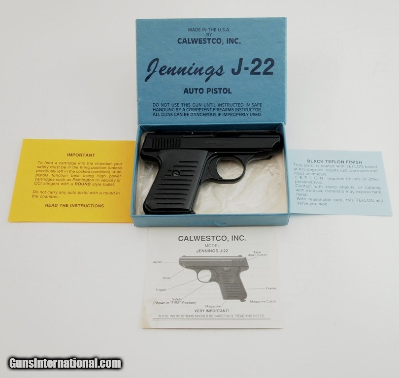 Description: Jennings J22 .22LR ANIB, 2" bbl, bright shiny bore, good rifling, iron sights, black Teflon finish, and black grips. This pistol is super clean with original box and paperwork. Sold AS-IS, No Return. Add 3% for Credit Card Shipping $25.00 SOLD |