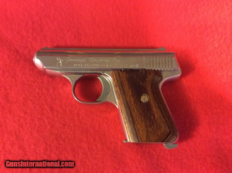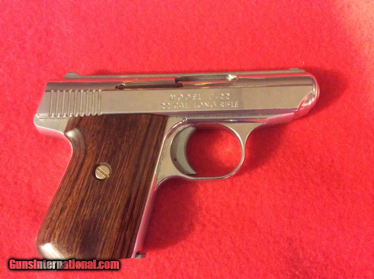 Description: For you viewing is a jennings model J-22 22 caliber pistol made in Chino California. nickel plated, walnut grips, 6 shot clip. 98% condition. Nice pocket pistol. call for more info. etc. thanks for looking SOLD |