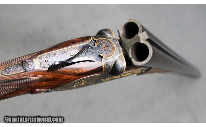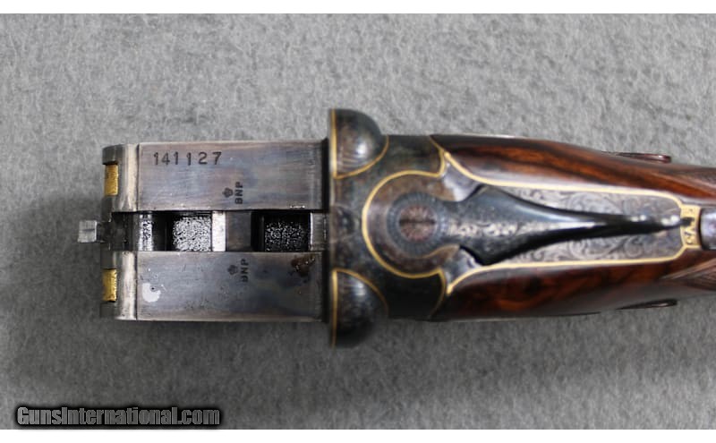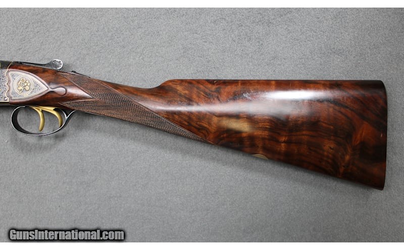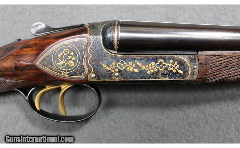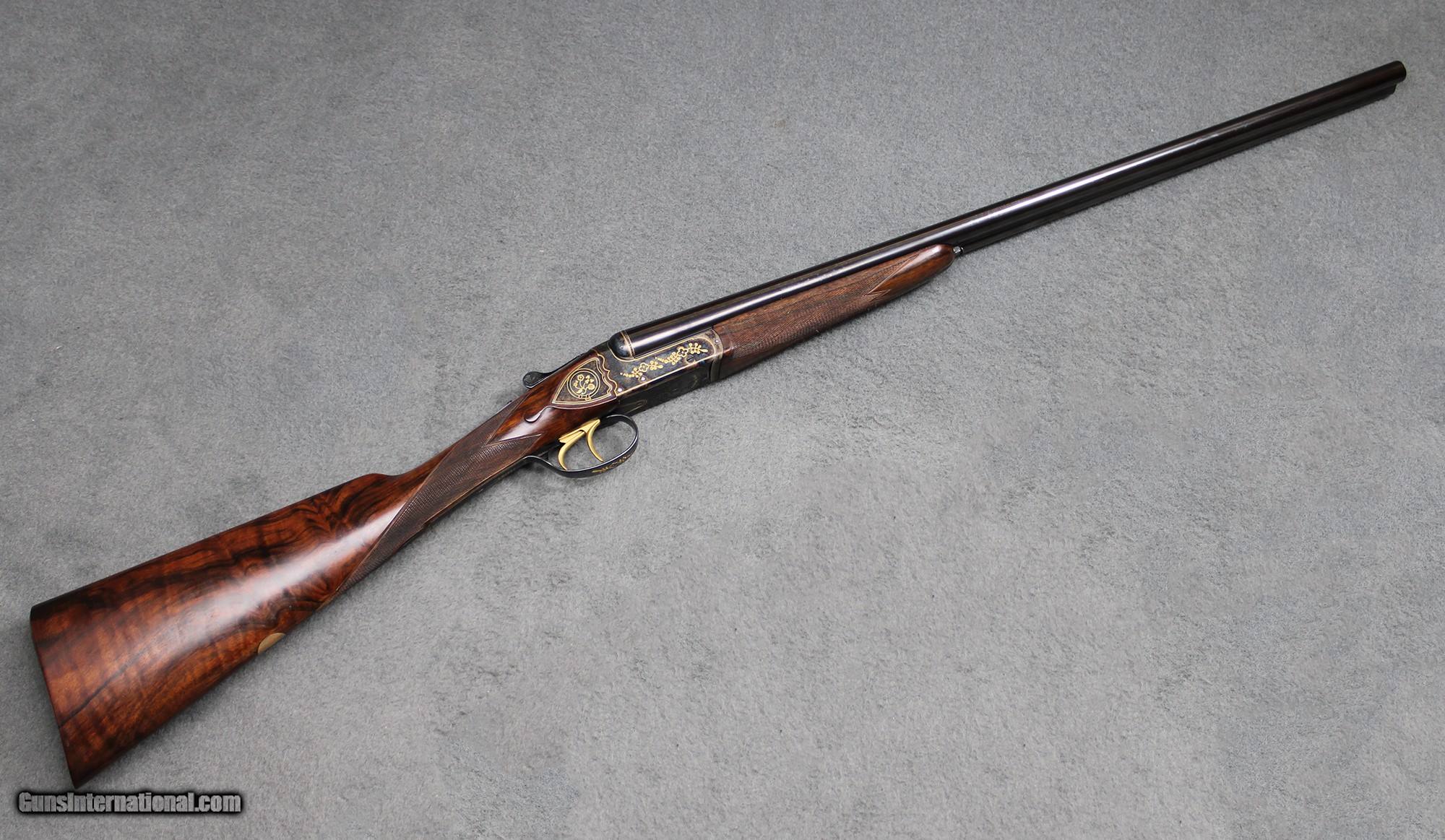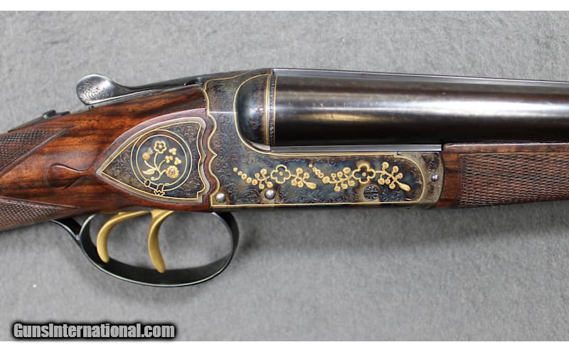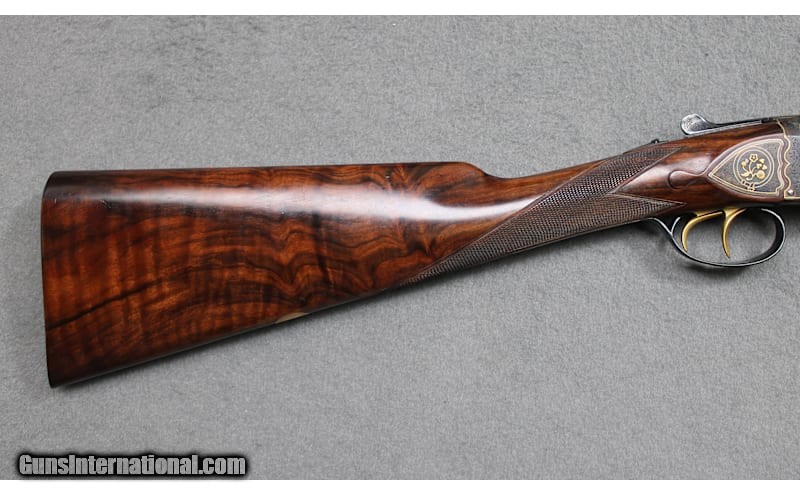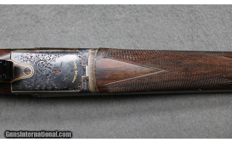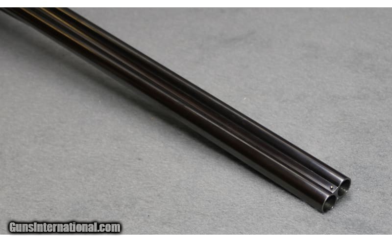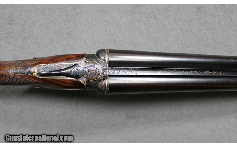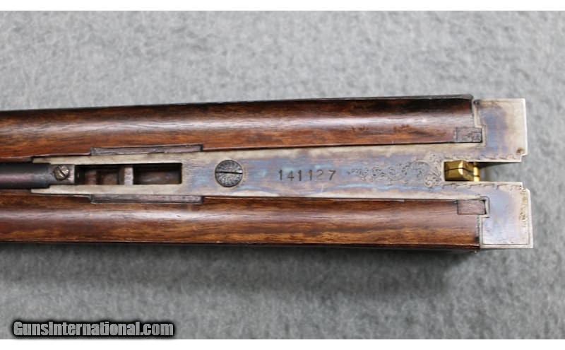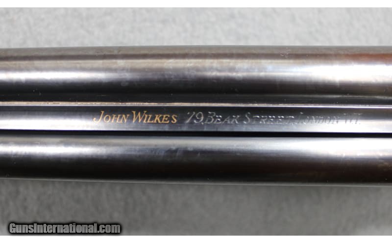 Description: John Wilkes Double Barrel Shotgun two barrel set chambered in 20 Gauge. 1970 dated Birmingham nitro proof marks. 26-inch barrels with 3-inch chambers, ejectors, and fixed chokes that gauge Full and Modified. Color casehardened boxlock action with inlaid casehardened sideplates and floral scroll engraving with gold inlaid line borders as well as relief gold inlaid floral designs along with a tang mounted automatic safety. Straight (English) stock with checkered butt. Second pair of 26-inch barrels with 3-inch chambers, ejectors, and fixed chokes that gauge Modified and Improved Cylinder. Comes in a leather takedown case with canvas cover along with brass oiler and snap caps. Import marked on bottom of barrels. 20 Gauge Chambers: 3 inch Metal Condition: Very Good with Minor Handling Marks Wood Condition: Very Good with Minor Handling Marks Bore Condition: Bright and Clear with No Pitting Barrels: 26-inch Barrels Choked Modified and Improved Cylinder Triggers: Double Stock Dimensions: LoP: 15-1/8 inch; DC: 1-1/4 inch; DHeel: 15-1/8 inch Fore End: Checkered walnut Sights: Single Brass Bead Sight On The Smooth Concave Solid Rib Chokes: Fixed Improved Modified & Full Item Location: Fort Worth, TX Price: $19,999.99 Contact Seller |