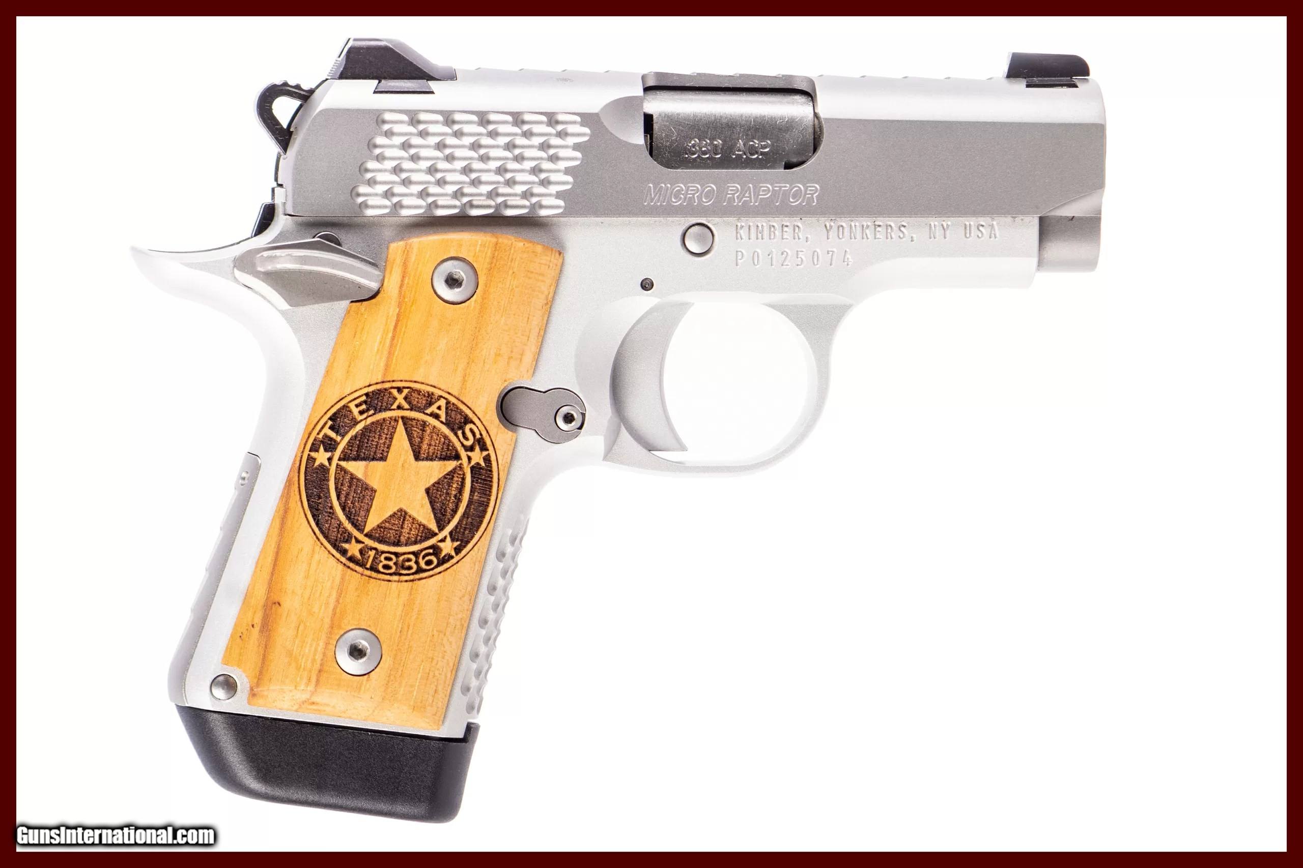 Description: Kimber Micro Raptor chambered in 380ACP (9mm Kurtz) with a 2¾ inch barrel, mirror-shine bore with nice sharp rifling. This pistol comes with 1 extra magazine, box, soft case, and features a set of Texas 1836 Lone Star themed grips. The NRA grading condition for this USED firearm is Excellent. We ship domestically in the United States. Additional shipping rates apply to Alaska and Hawaii. Dury's Lifetime Warranty: All firearms purchased from Dury’s Gun Shop, NEW or USED, are covered by a lifetime warranty. We will repair or replace, at our discretion, any firearm purchased from Dury’s Gun Shop, Inc. for as long as it is owned by the purchaser. This warranty is not transferable. WE BUY GUNS! NO COLLECTION TOO BIG OR SMALL FOR OUR GUNS INTERNATIONAL CUSTOMERS ALL OF OUR FIREARMS CAN BE PURCHASED DIRECTLY FROM OUR DURY'S GUNS SITE ! SOLD Manufacturer: Kimber Model: Micro Raptor Caliber Info: 380 ACP (9mm Kurtz) Barrels: 2inches |