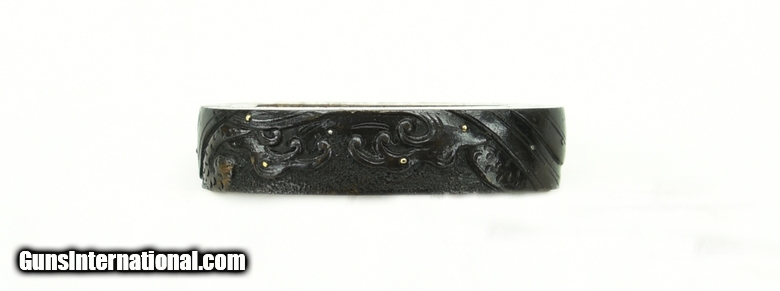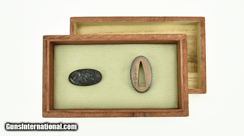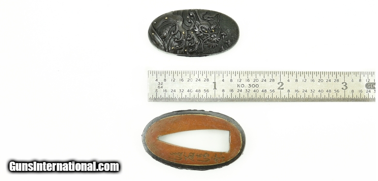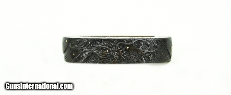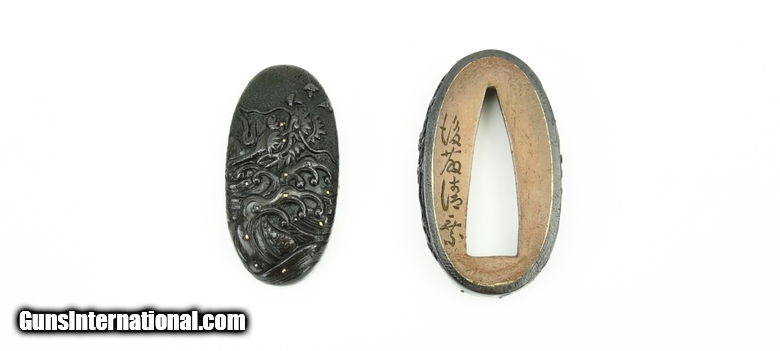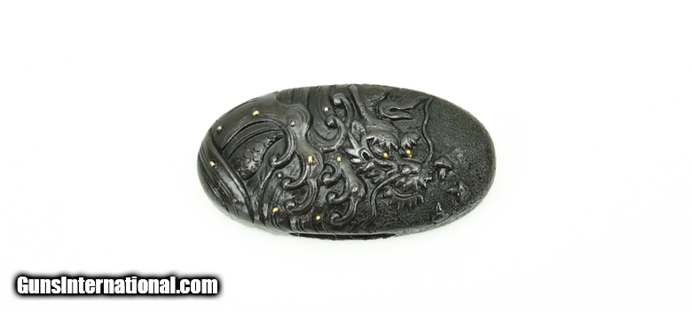 Description: Kinko Fuchi Kashira. Shakudo with Dragon amidst big curling Waves accentuated with gold spray. Dragon’s eyes are also gold. Signed: Goto. SOLD |