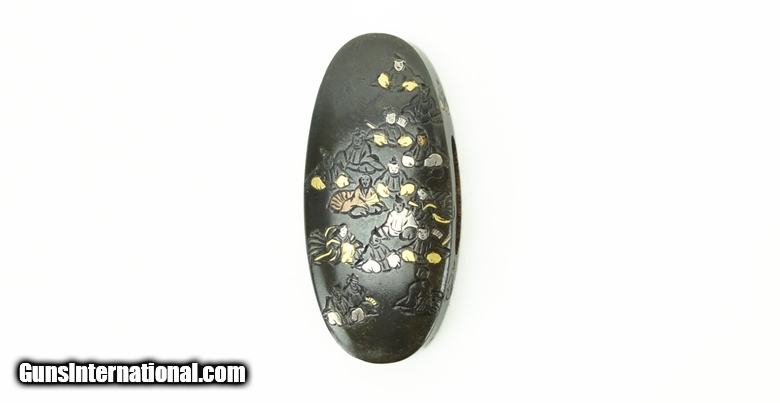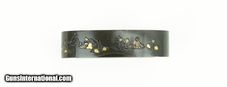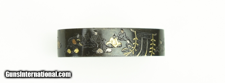 Kinko Fuchi Kashira. “36 Immortal Poets” with gold, silver, and copper highlights. Signed: Hosono Masa Mori. Fine condition.