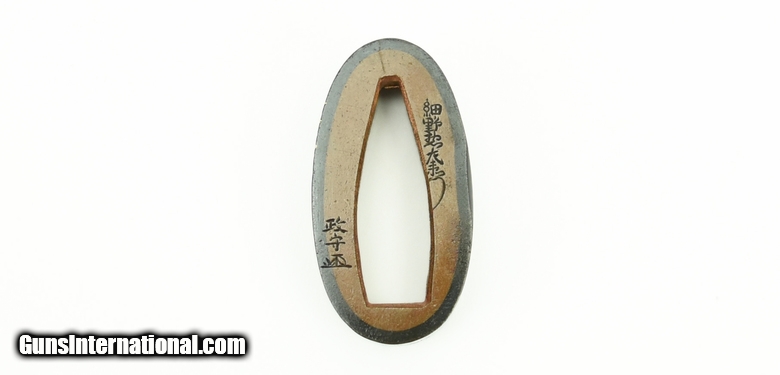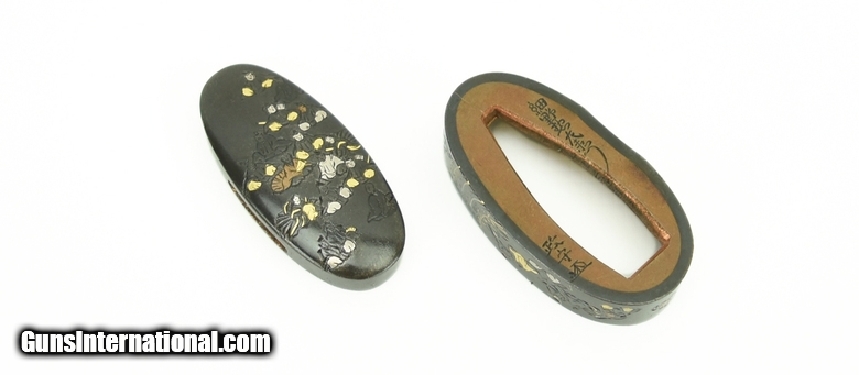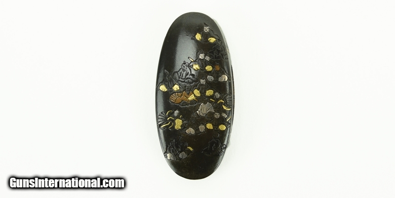 Description: Kinko Fuchi Kashira. “36 Immortal Poets” with gold, silver, and copper highlights. Signed: Hosono Masa Mori. Fine condition. SOLD |