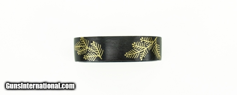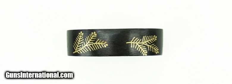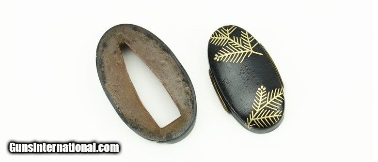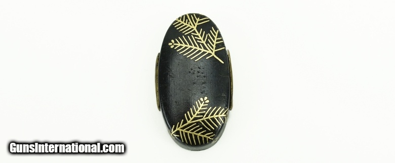 Description: Kinko Fuchi Kashira. Shakudo with fine yasuri. Inlaid with young pine in gold. Unsigned. Excellent condition. SOLD |